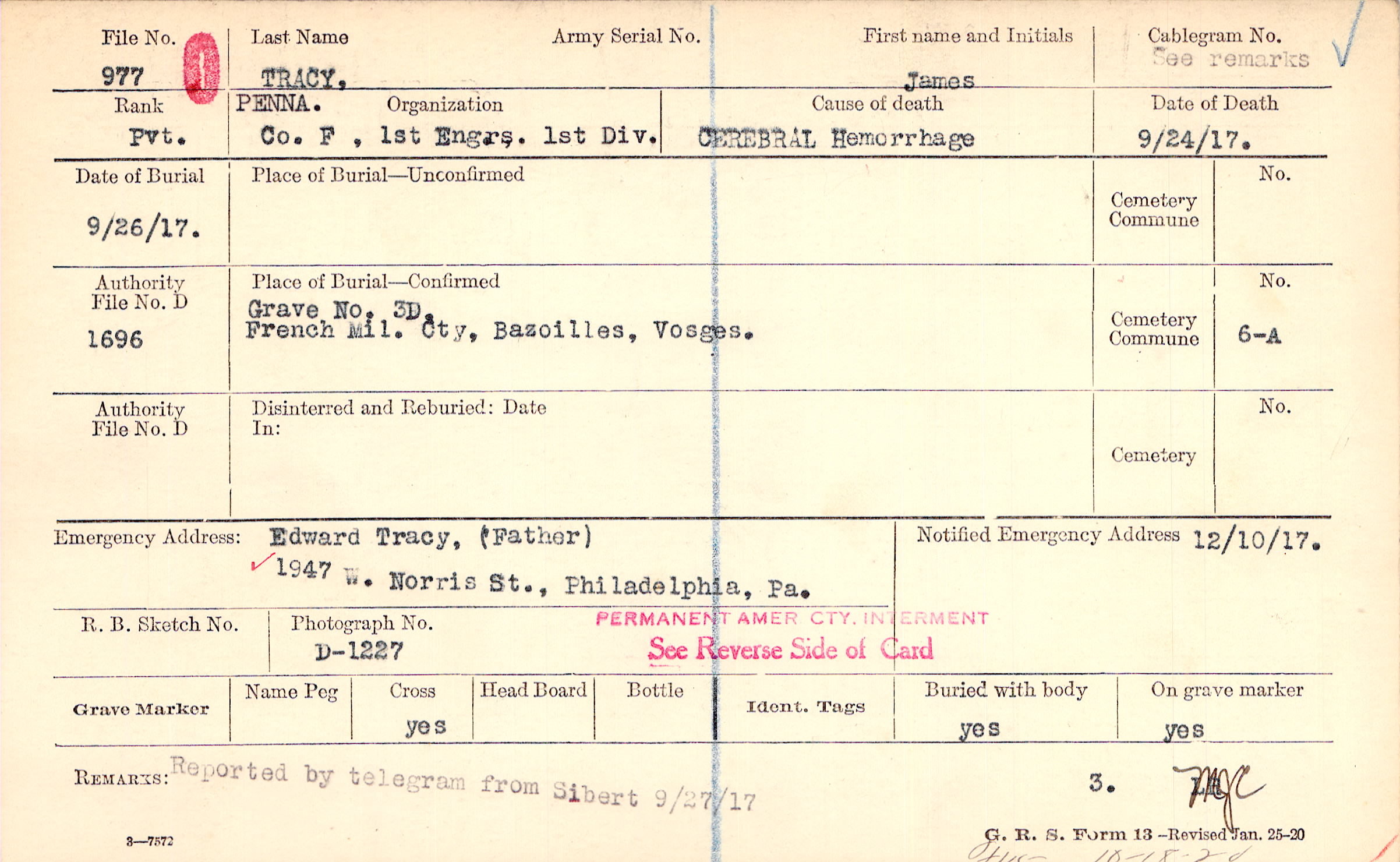 Edward Tracy, (Father), 1947 W. Norris St., Philadelphia, Pa.