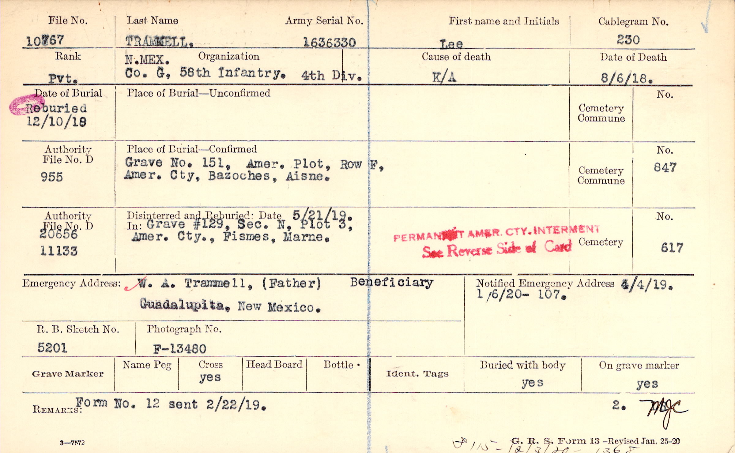 W. A. Trammell, (Father), Guadalupita, New Mexico., Beneficiary
