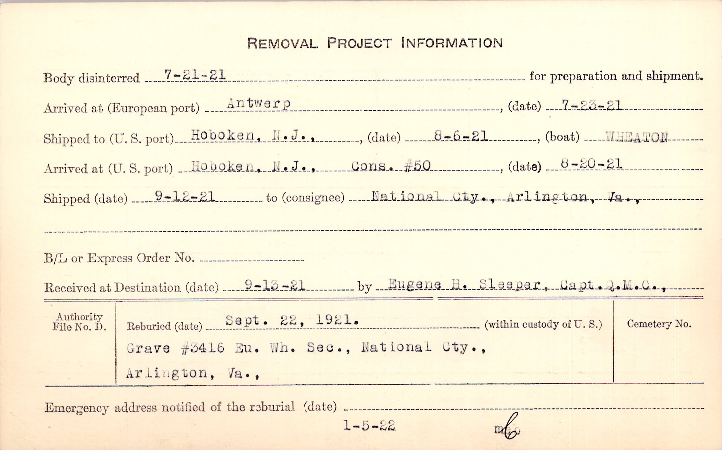 Body disinterred 7/21/1921 for preparation and shipment.
