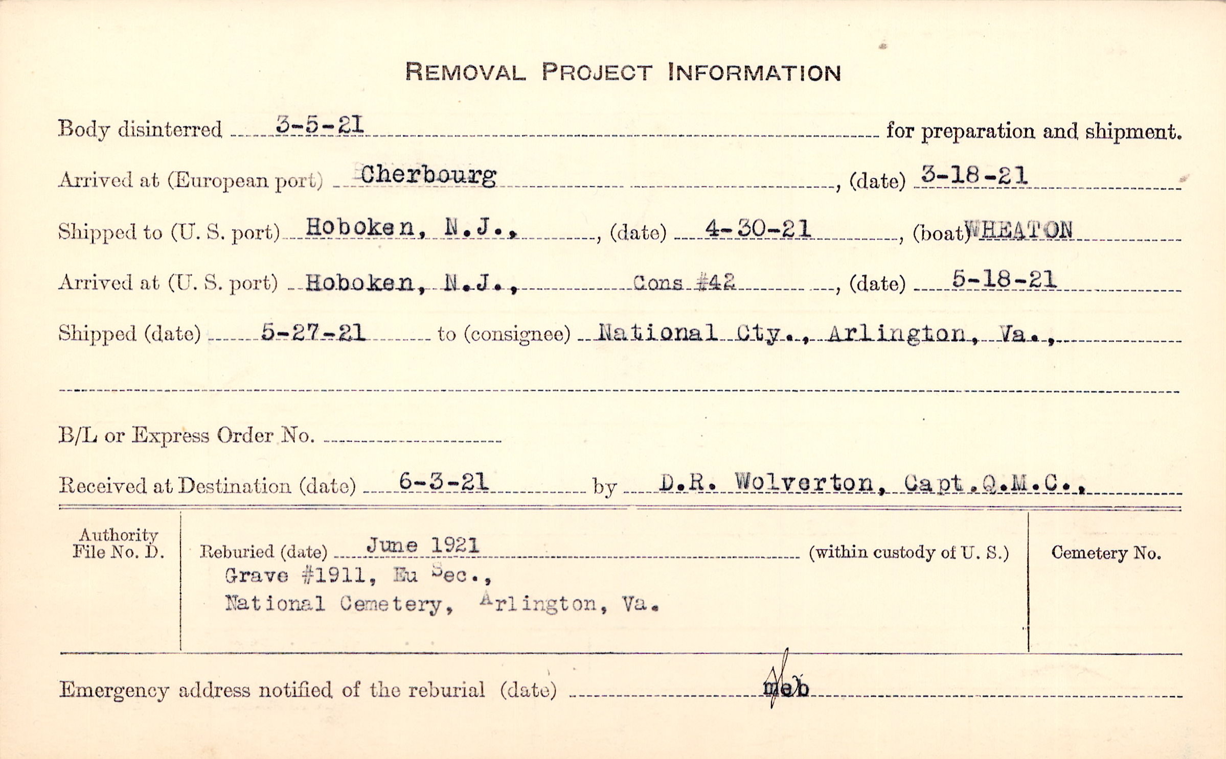 Body disinterred 3/5/1921 for preparation and shipment.