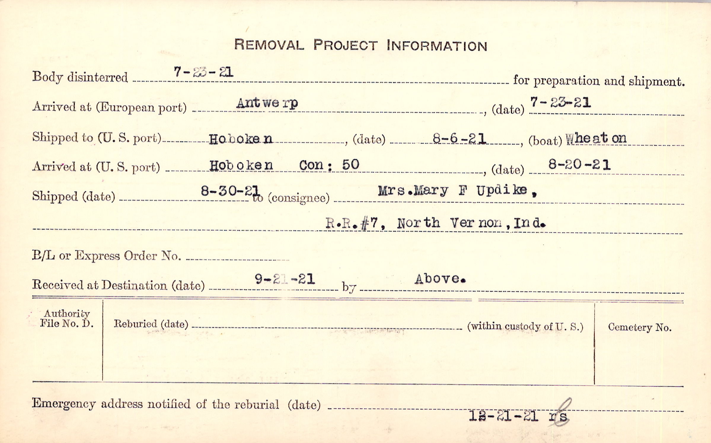Body disinterred 7/23/1921 for preparation and shipment.