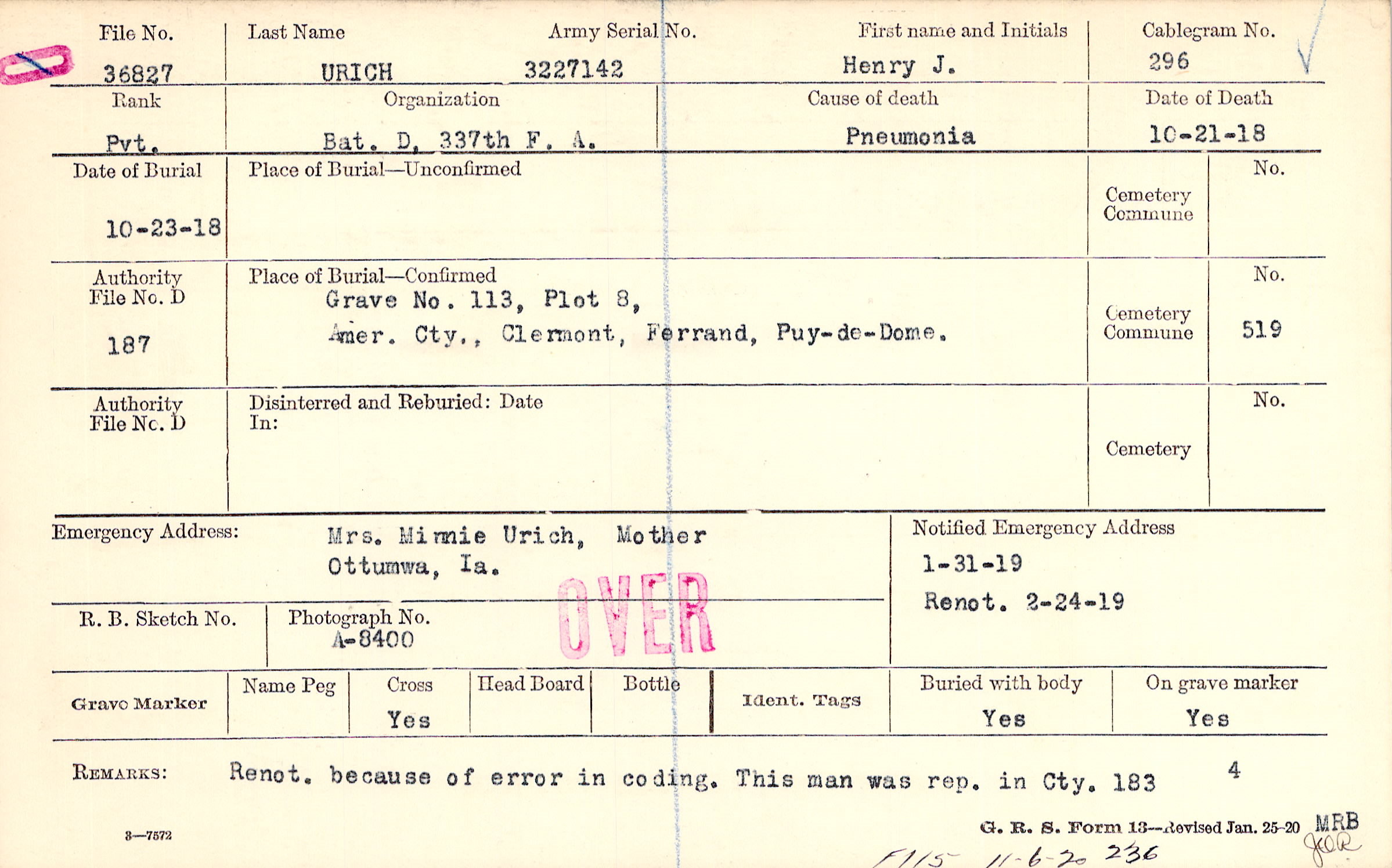 Grave 113, Plot 8, Amer. Cty., Clermont, Ferrand, Puy-de-Dome.