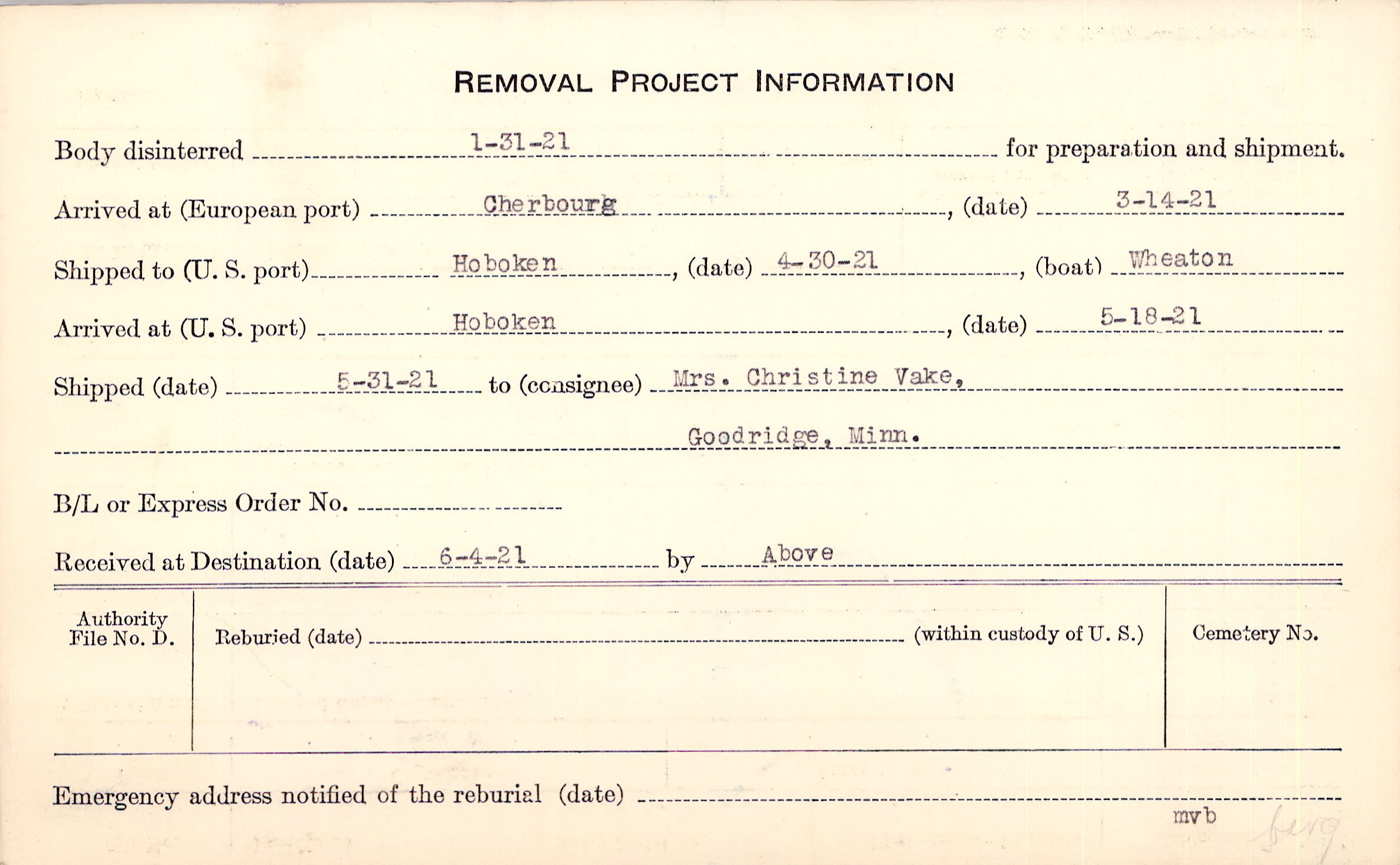 Body disinterred 1/31/1921 for preparation and shipment.