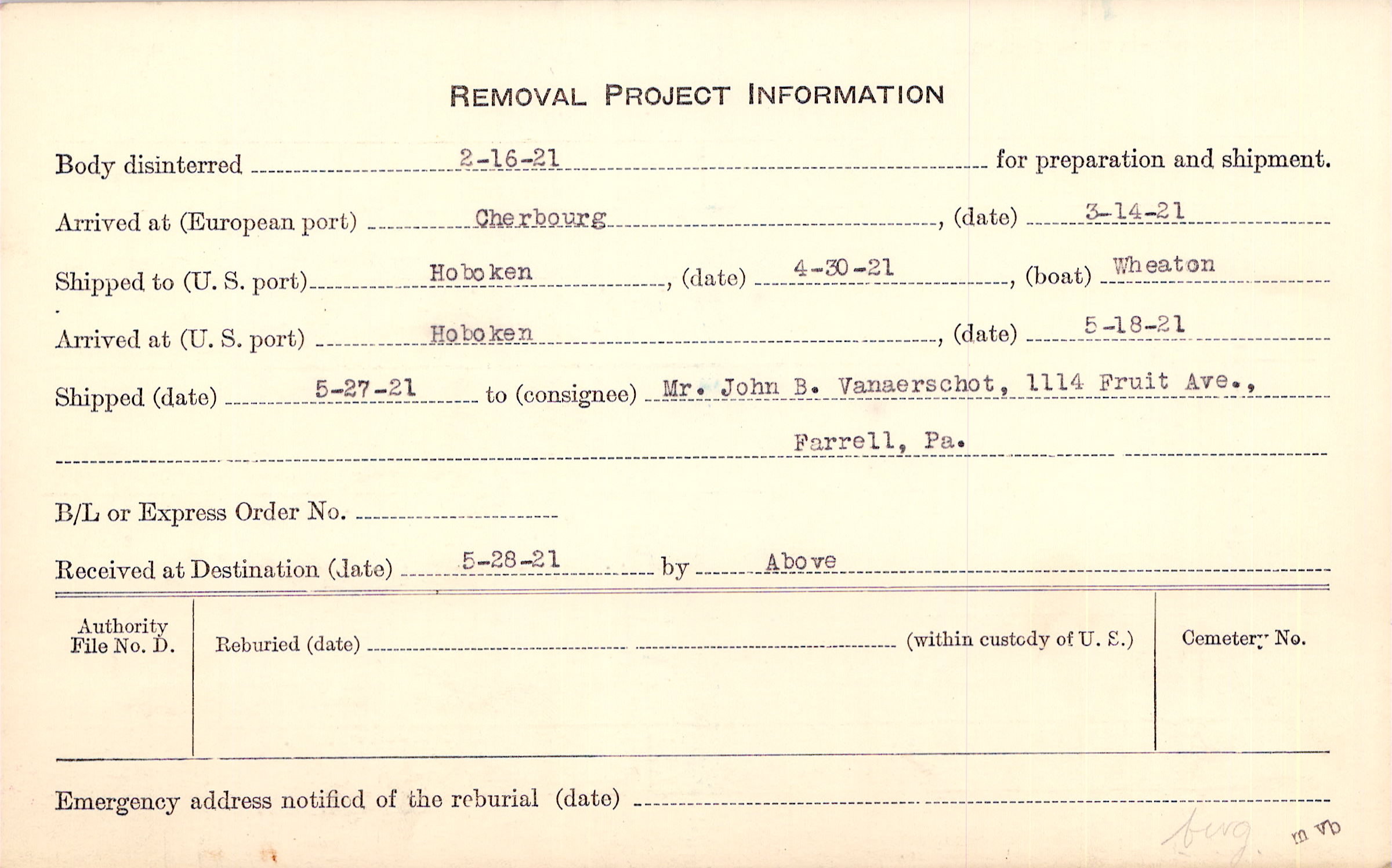 Body disinterred 2/16/1921 for preparation and shipment.