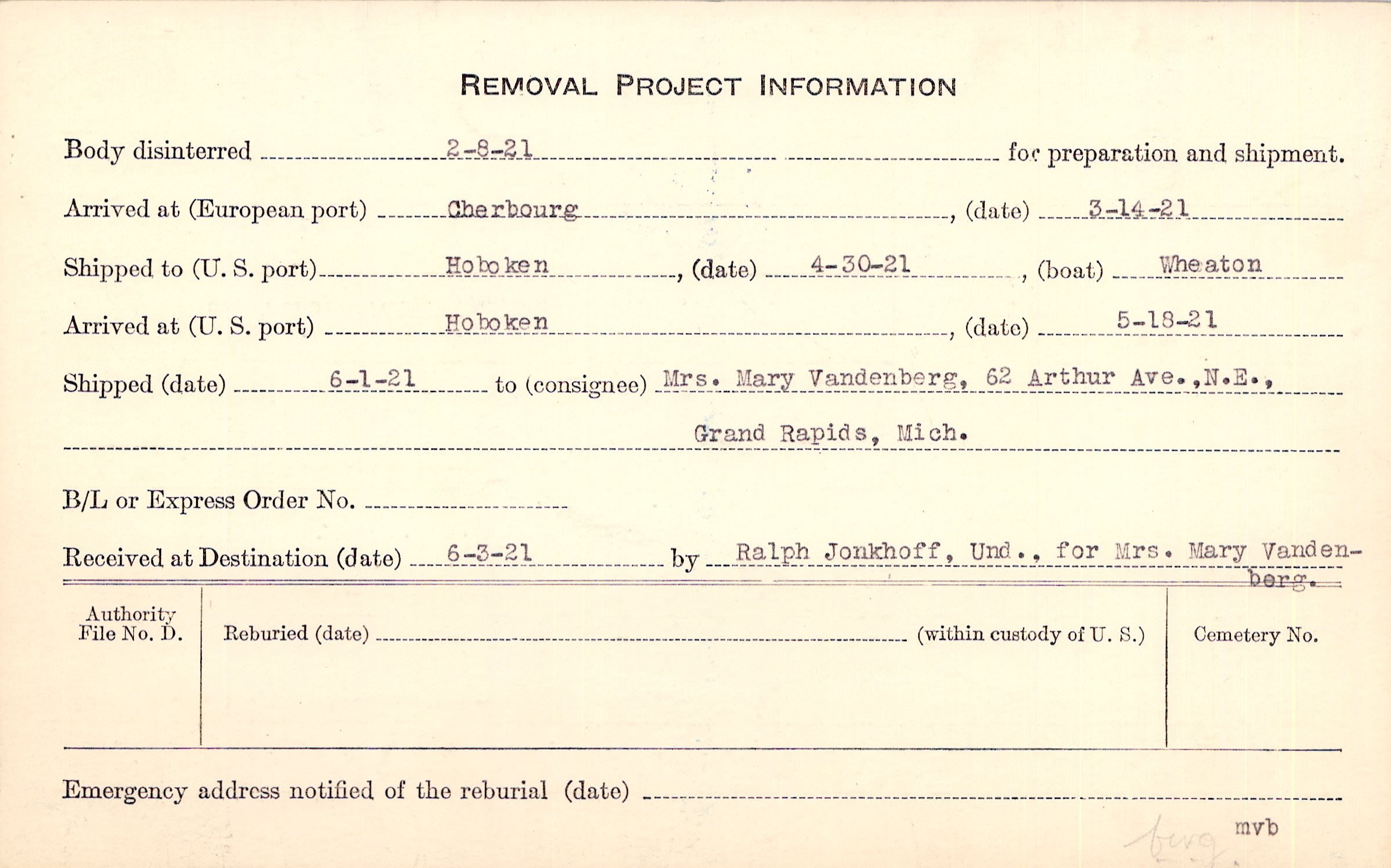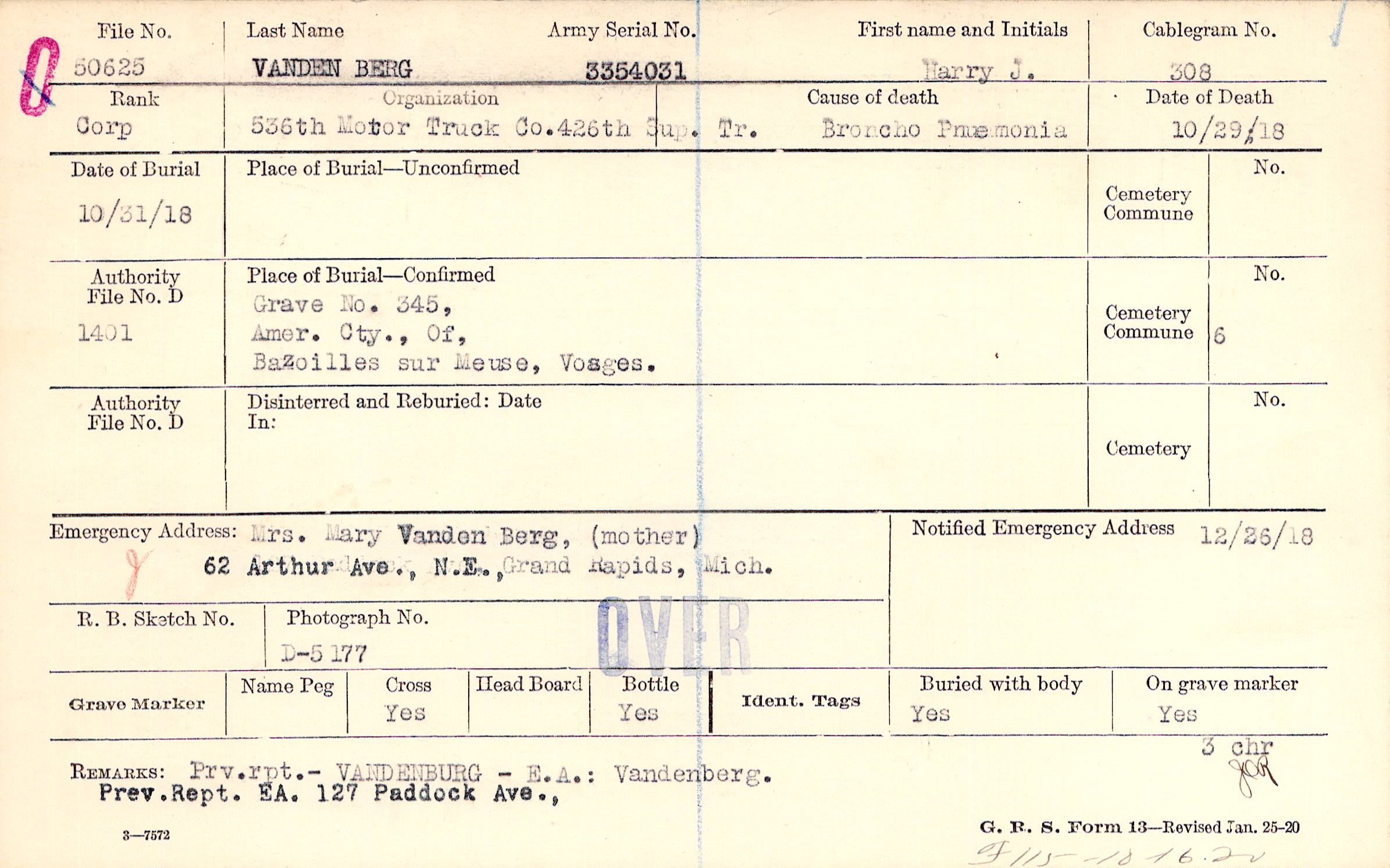 Mrs. Mary Vanden Berg, (mother), 62 Arthur Ave., N.E., Grand Rapids, Mich.