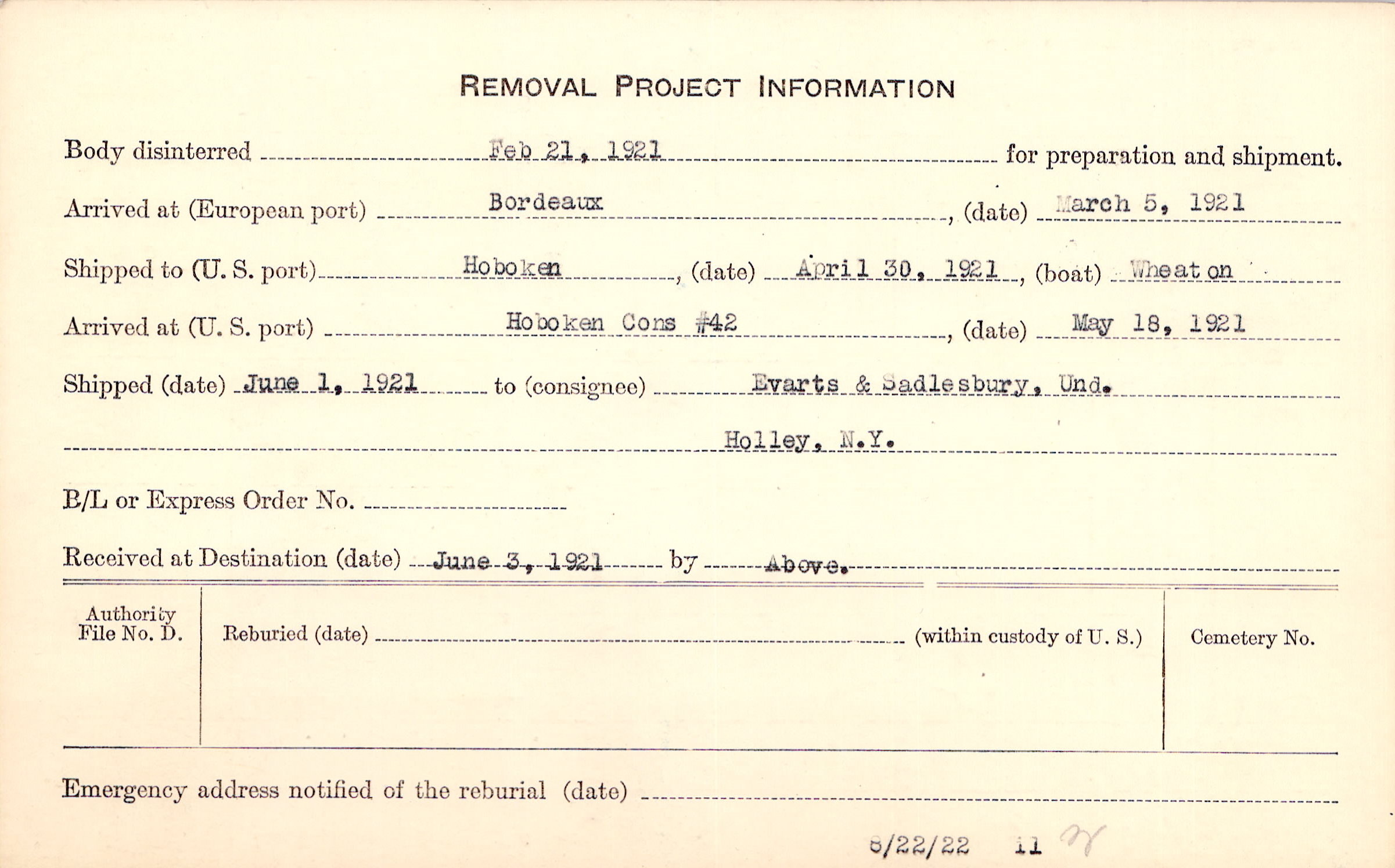 Body disinterred 2/21/1921 for preparation and shipment.