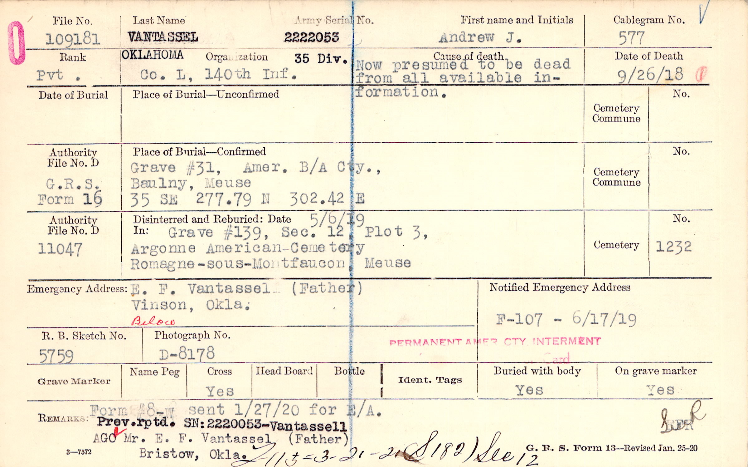 Prev. rptd. SN:2220053 - Vantassell AGO Mr. E. F. Vantassel (Father), Bristow, Okla., Form #8-w sent 1/27/20 for E/A., F115 - 3-21-21 (S182) Sec 12