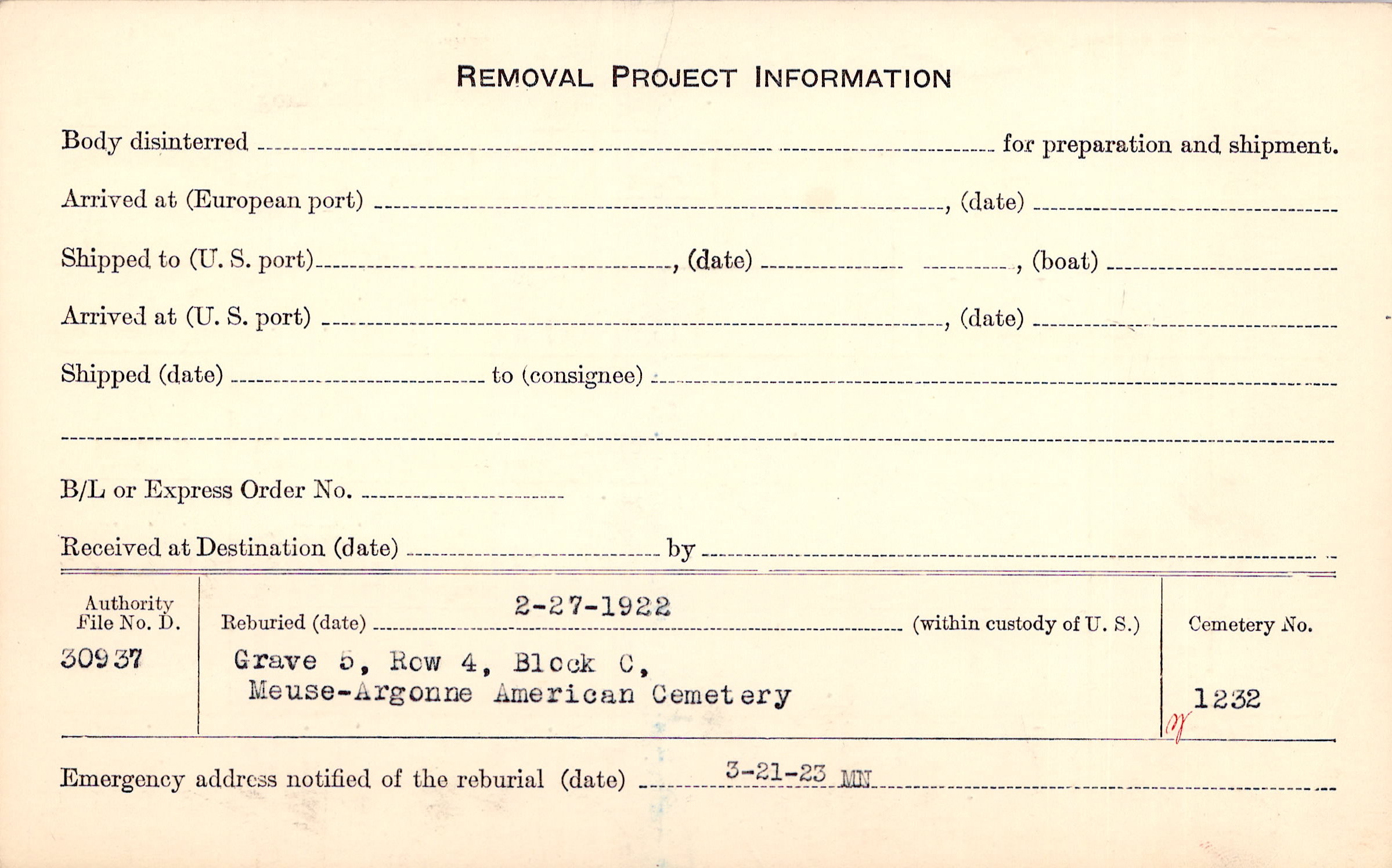 | Permanent Burial in Foreign Cemetery |