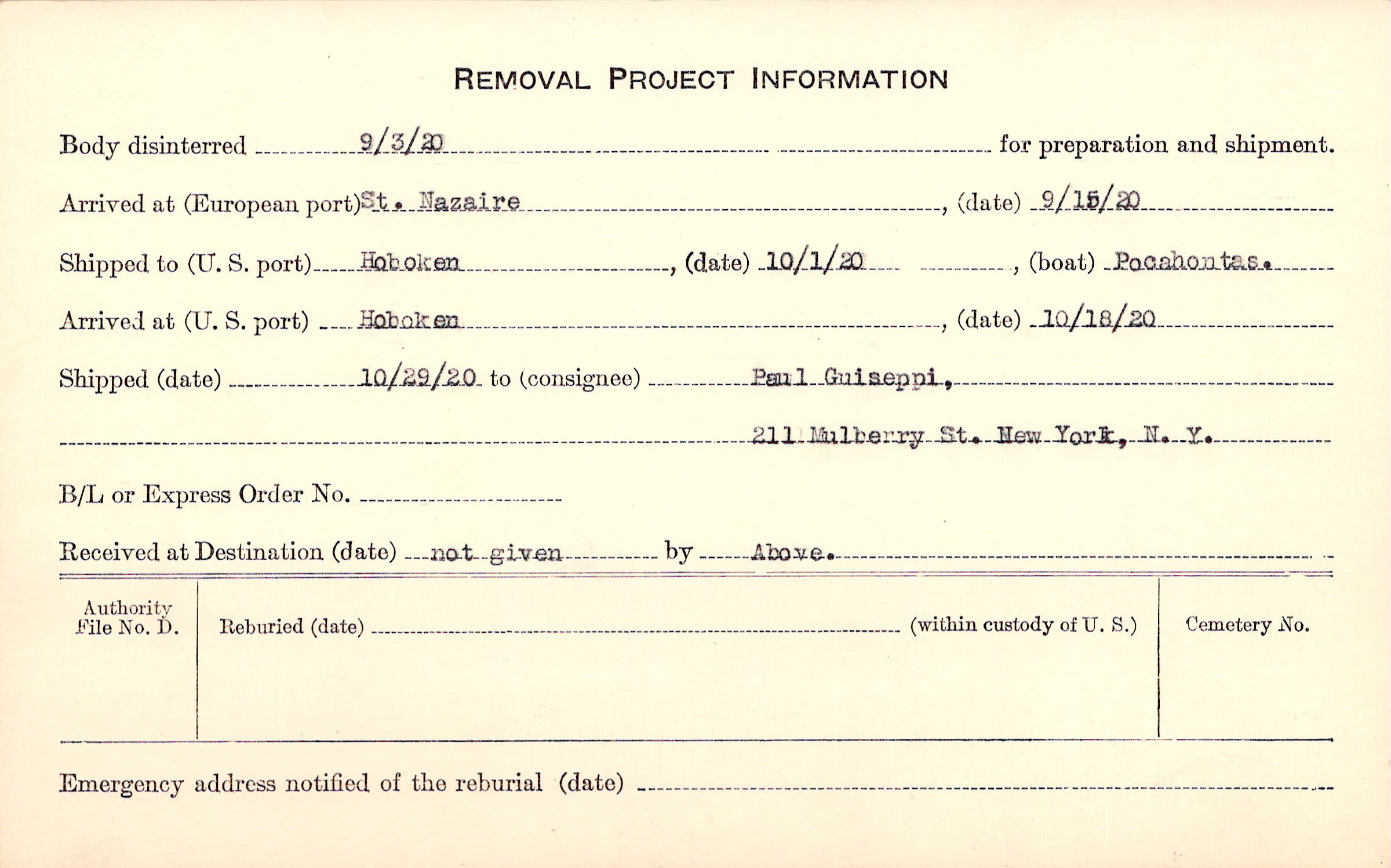 Body disinterred 9/3/1920 for preparation and shipment.