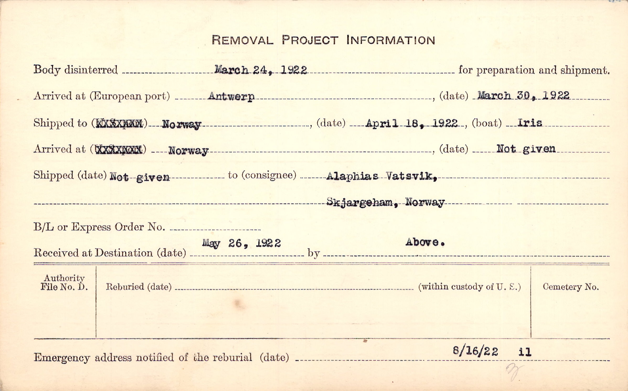 Body disinterred 3/24/1922 for preparation and shipment.