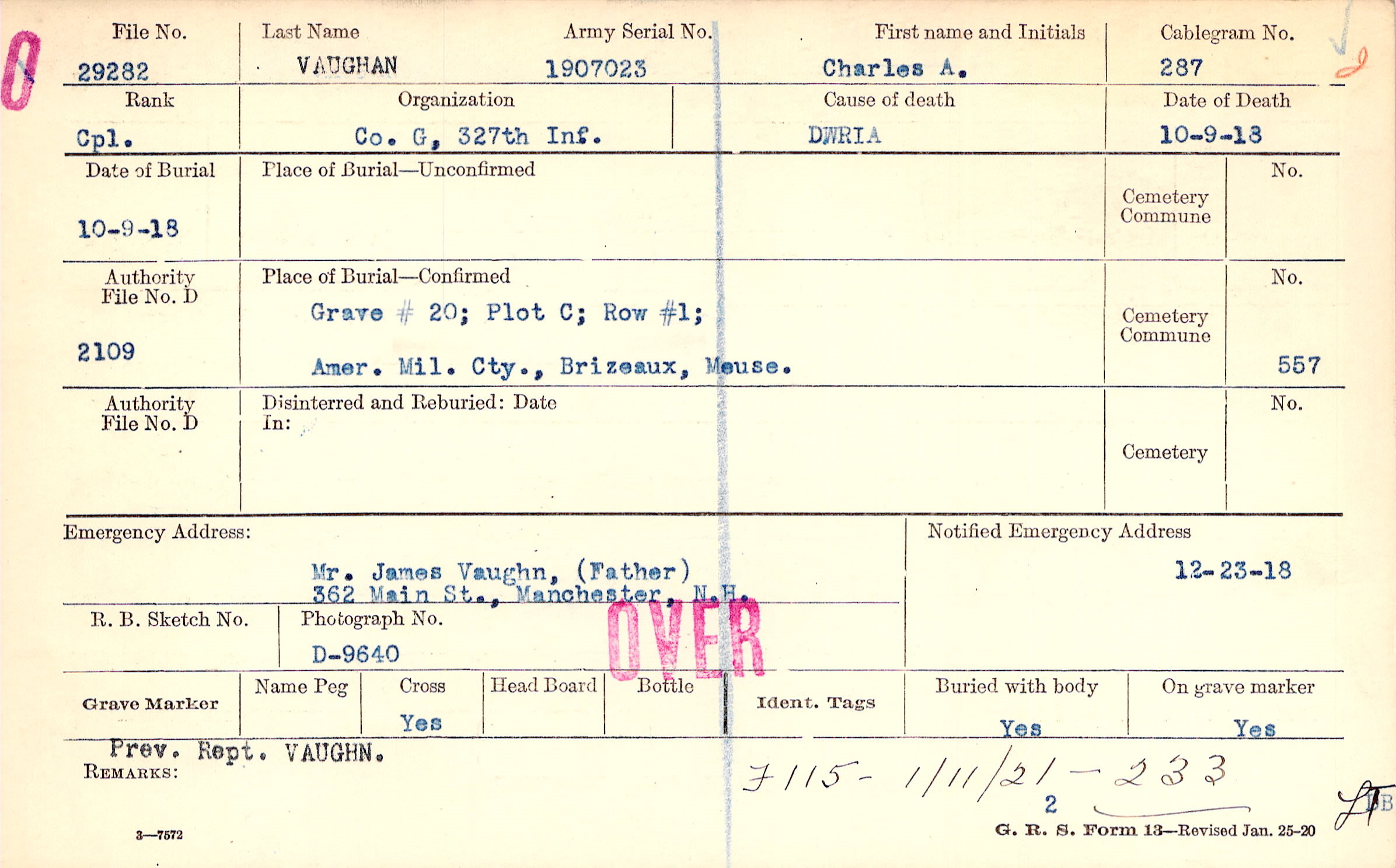 Grave #20, Plot C, Row #1, Amer. Mil. Cty., Brizeaux, Meuse.