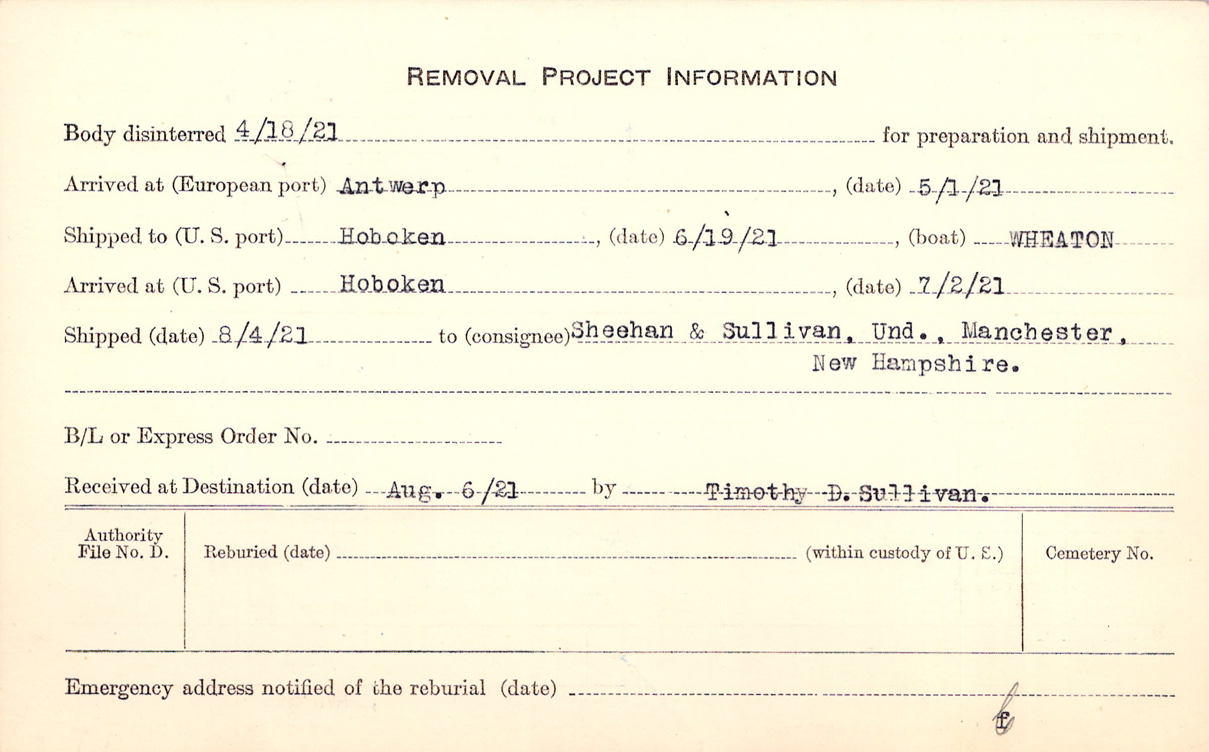 Body disinterred 4/18/1921 for preparation and shipment.