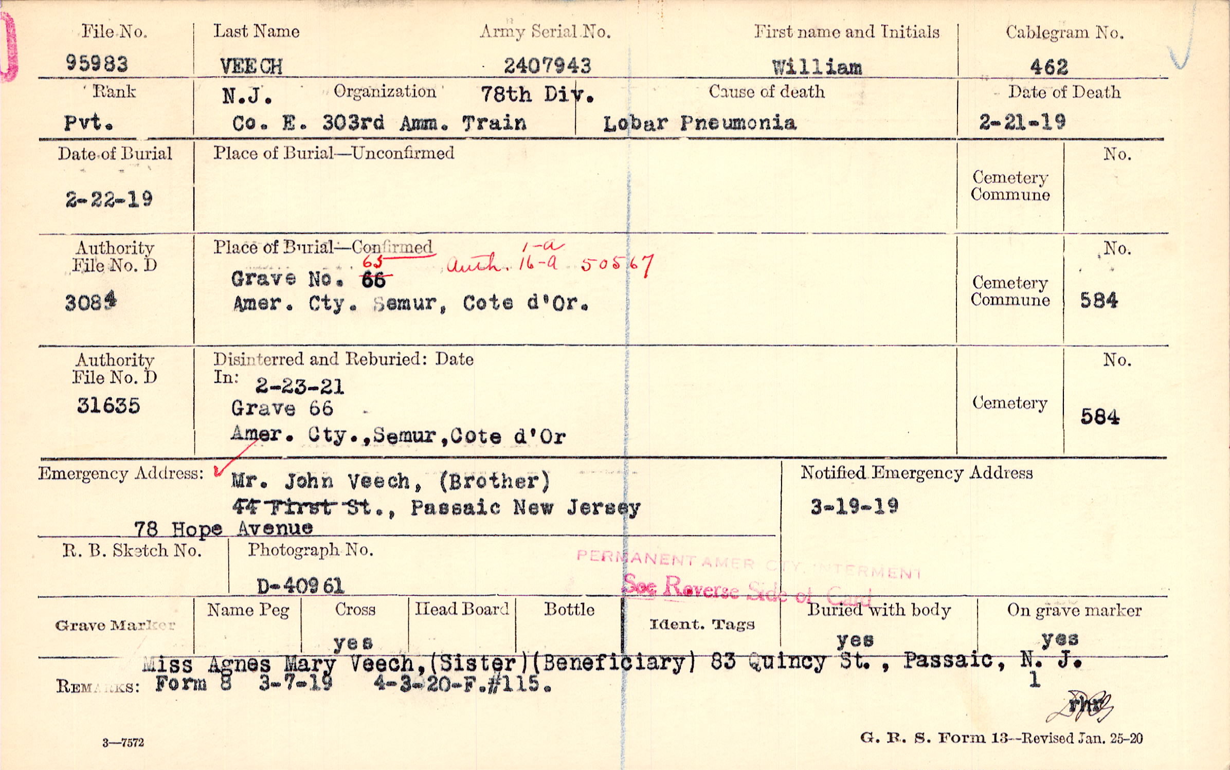 Mr. John Veech, (Brother), 78 Hope Avenue, Passaic New Jersey