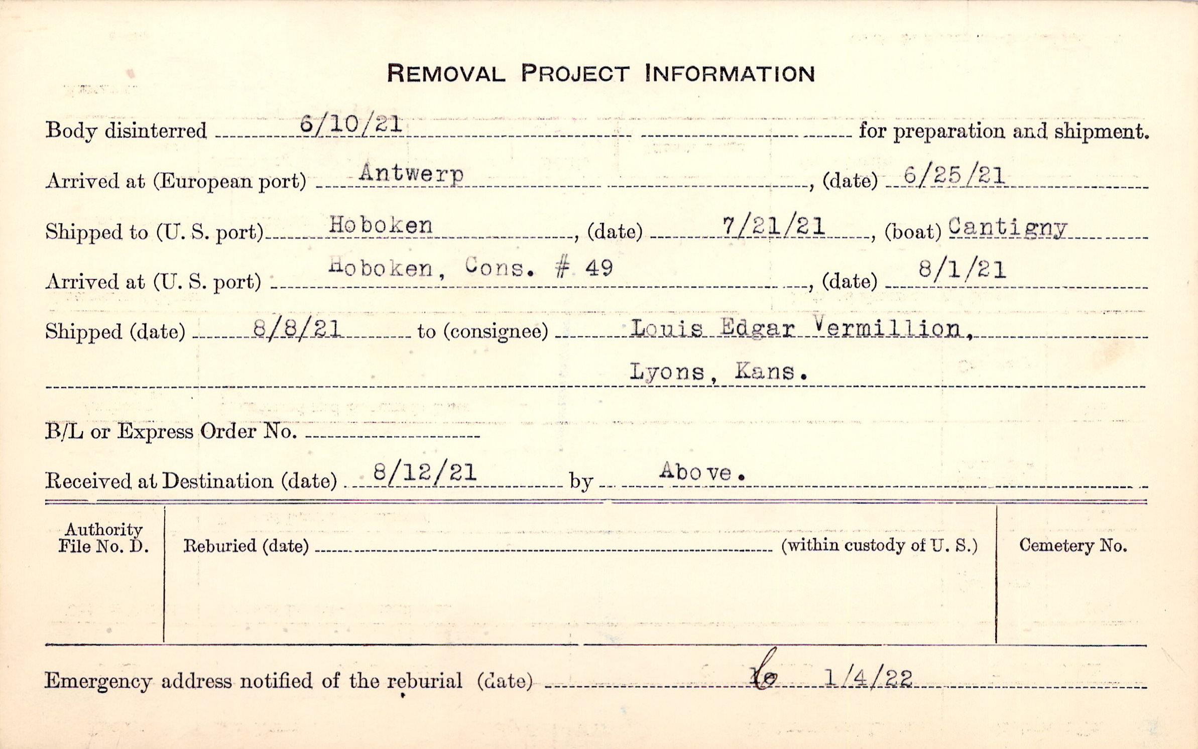 Body disinterred 6/10/1921 for preparation and shipment.