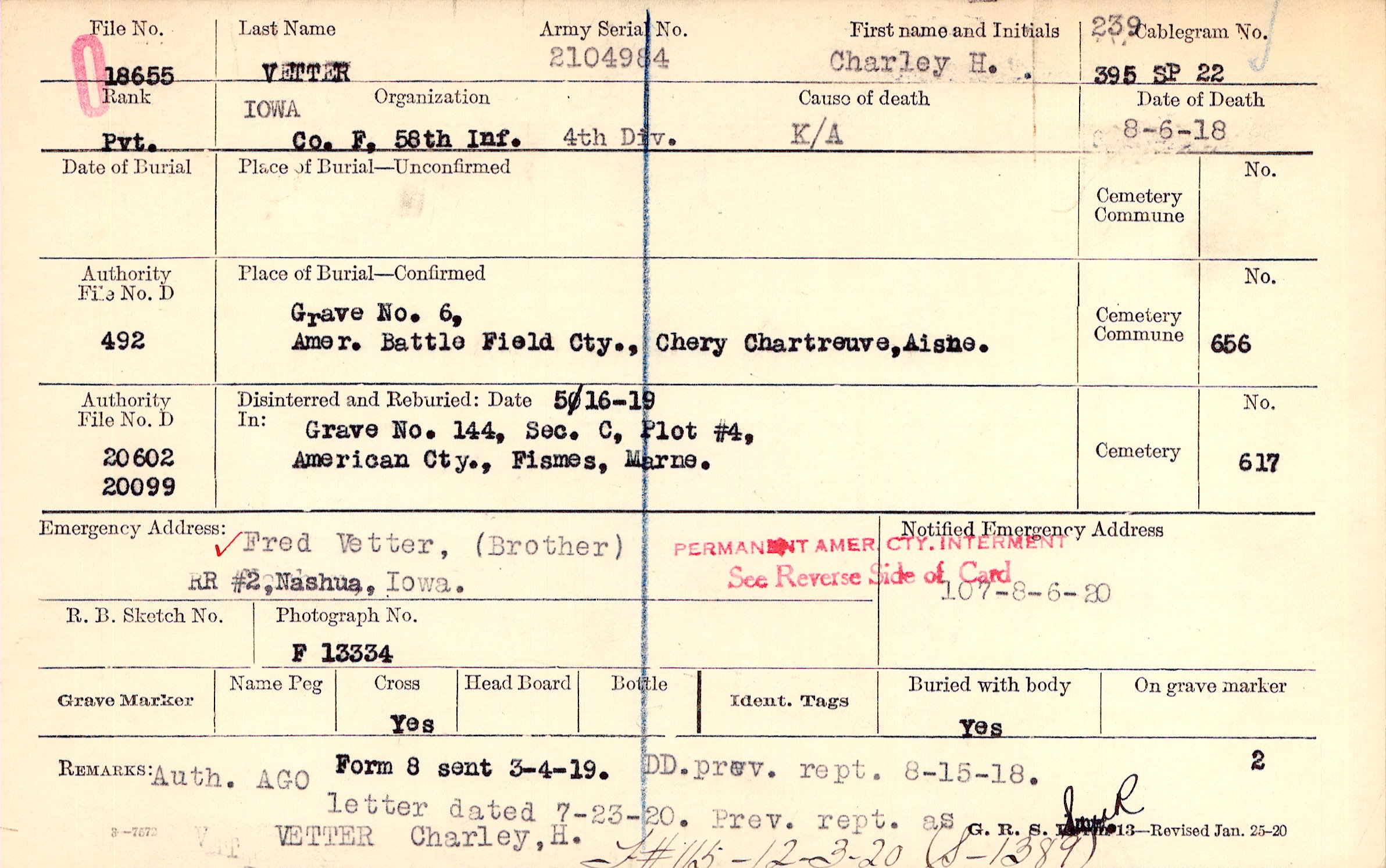 Grave 6, Amer. Battle field Cty., Chery Chartreuve, Aisne.
