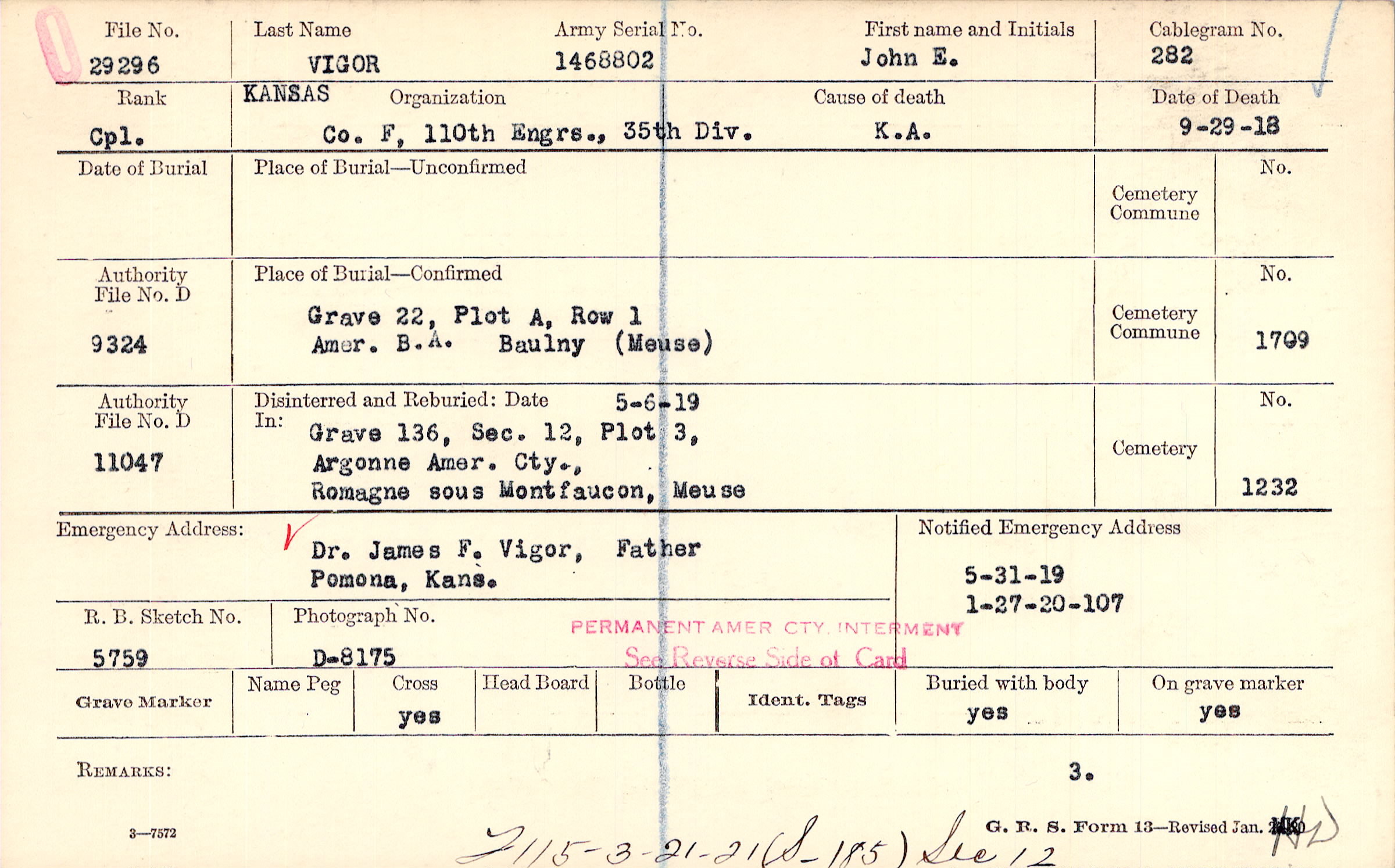 Grave 136, Section 12, Plot 3, Argonne American Cemetery, Romagne-sous-Montfaucon, Meuse