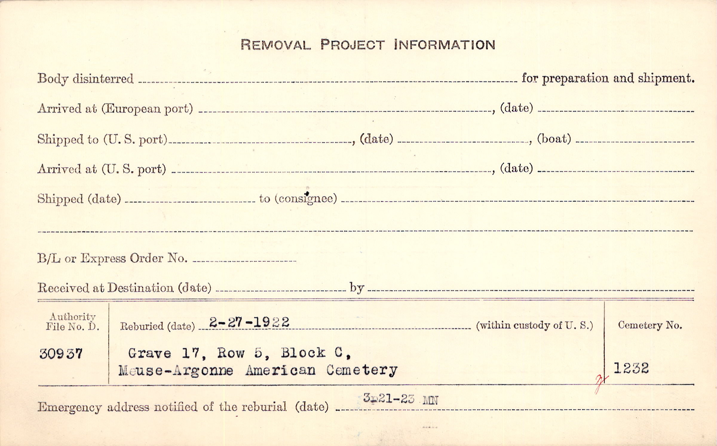 Grave 22, Plot A, Row 1, Amer. B/A, Baulny (Meuse)