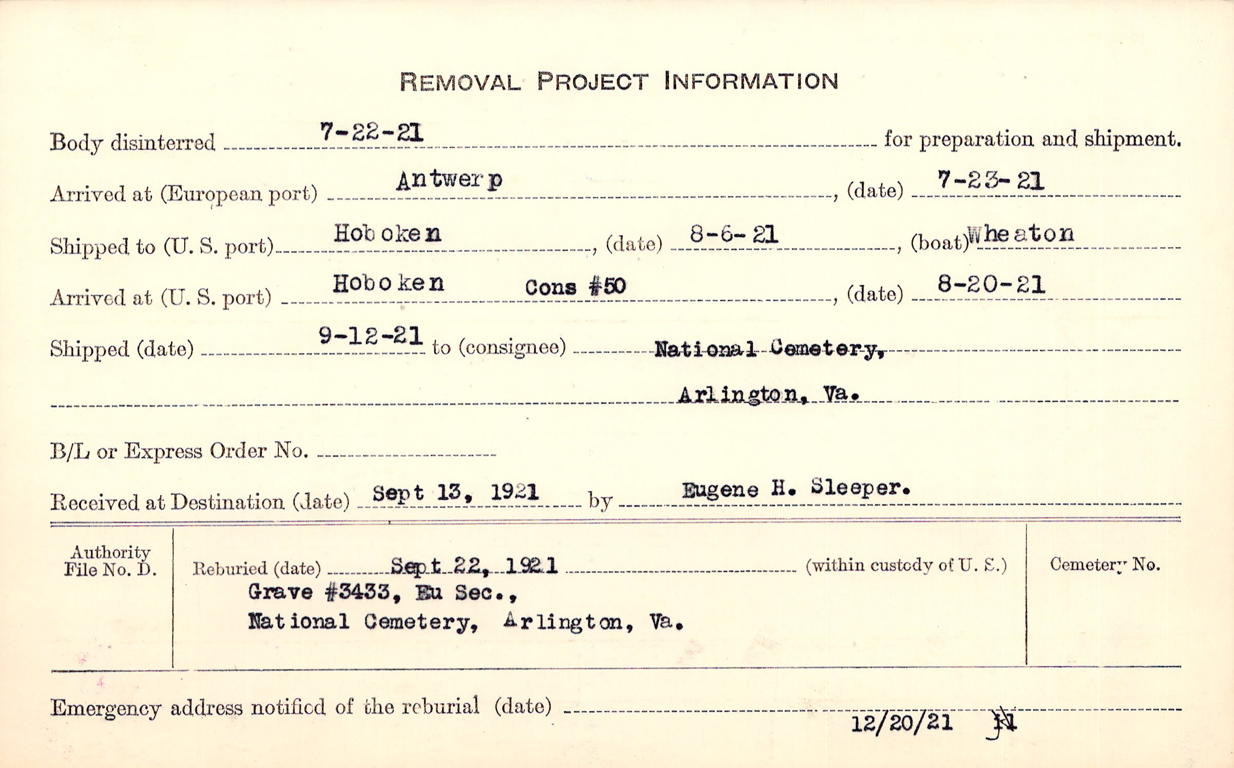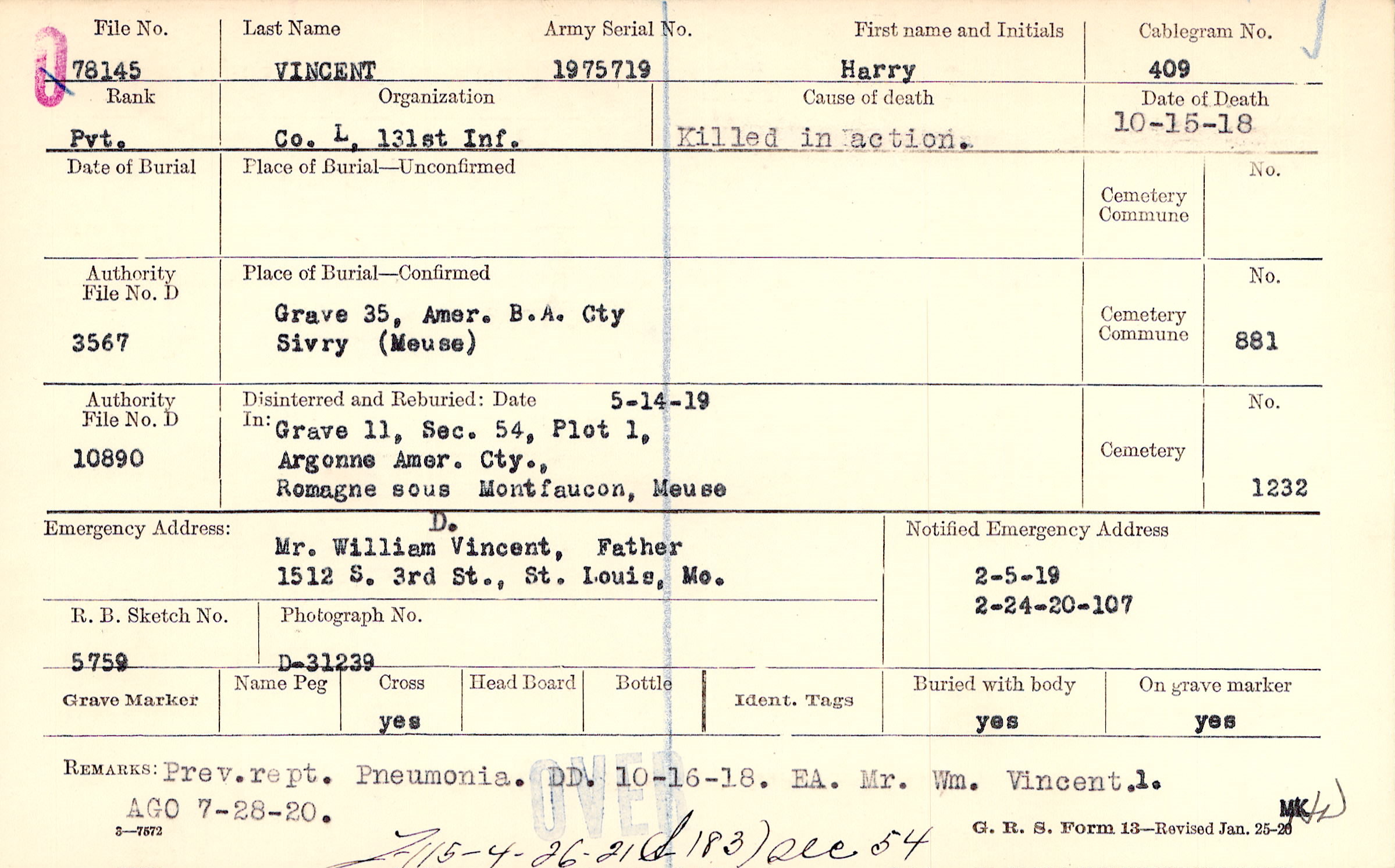 Prev. rept. Pneumonia. DD. 10-16-18. EA. Mr. Wm. Vincent. AGO 7-28-20., F115-4-26-21 (S183) sec 54