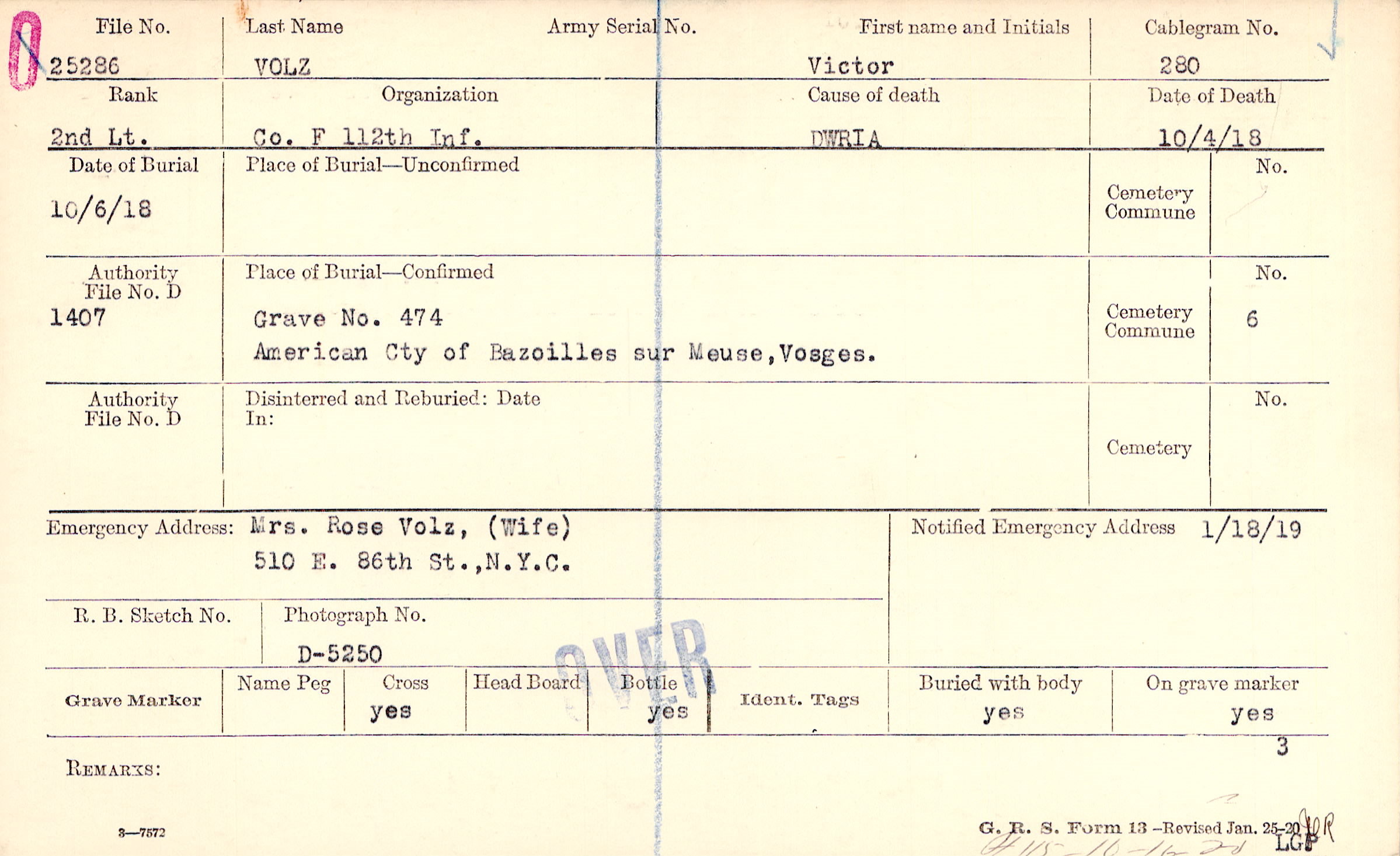 Mrs. Rose Volz, (Wife), 510 E. 86th St., N.Y.C.