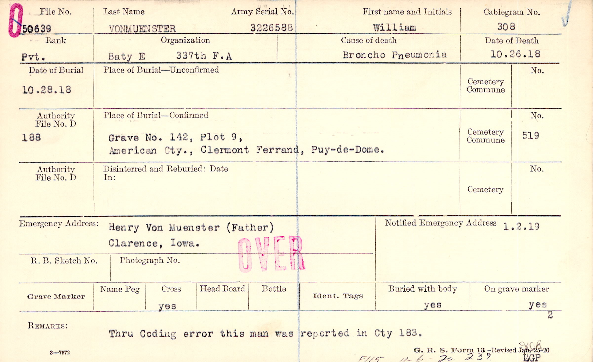 Grave 142, Plot 9, American Cty., Clermont Ferrand, Puy-de-Dome.