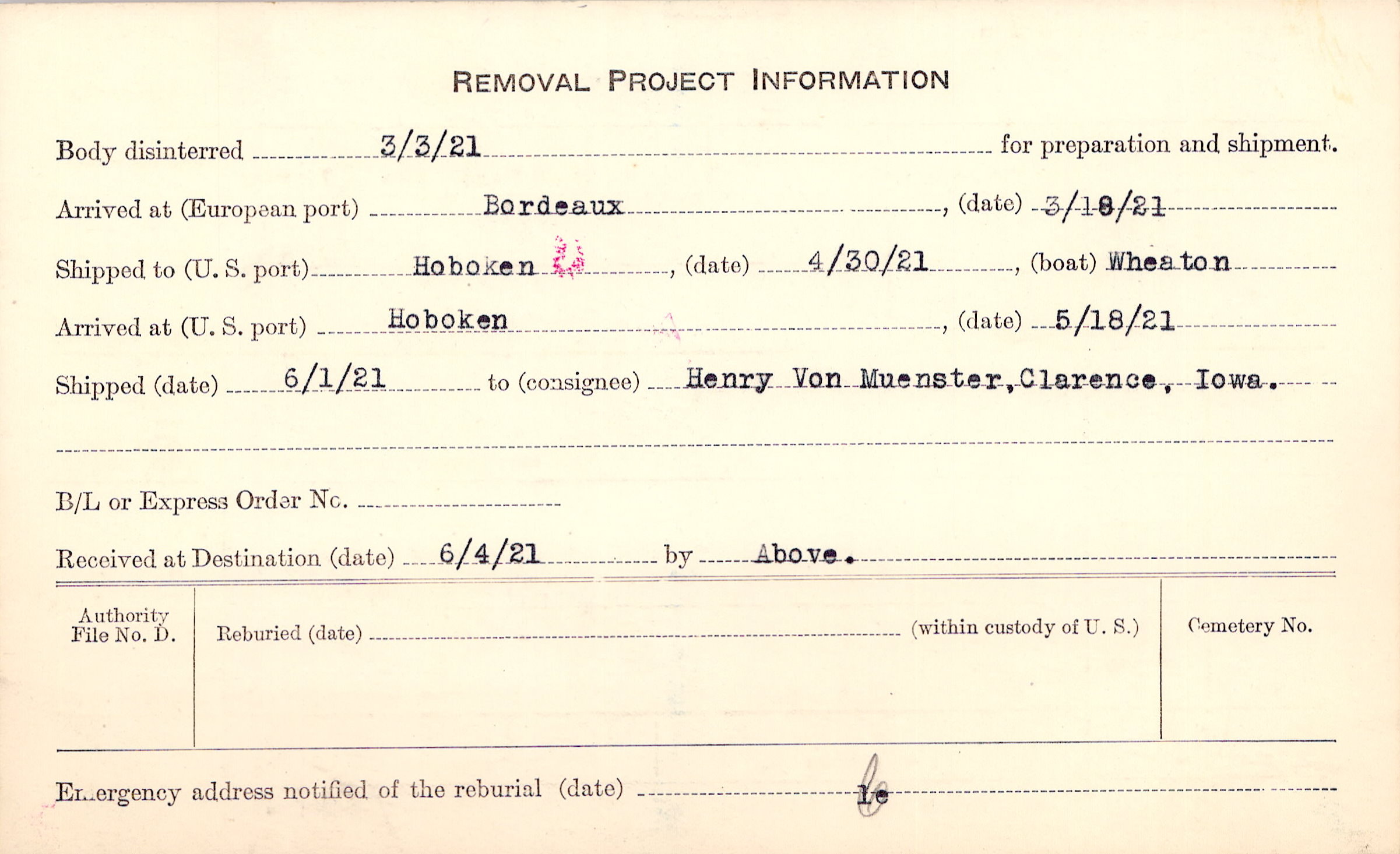 Body disinterred 3/3/1921 for preparation and shipment.