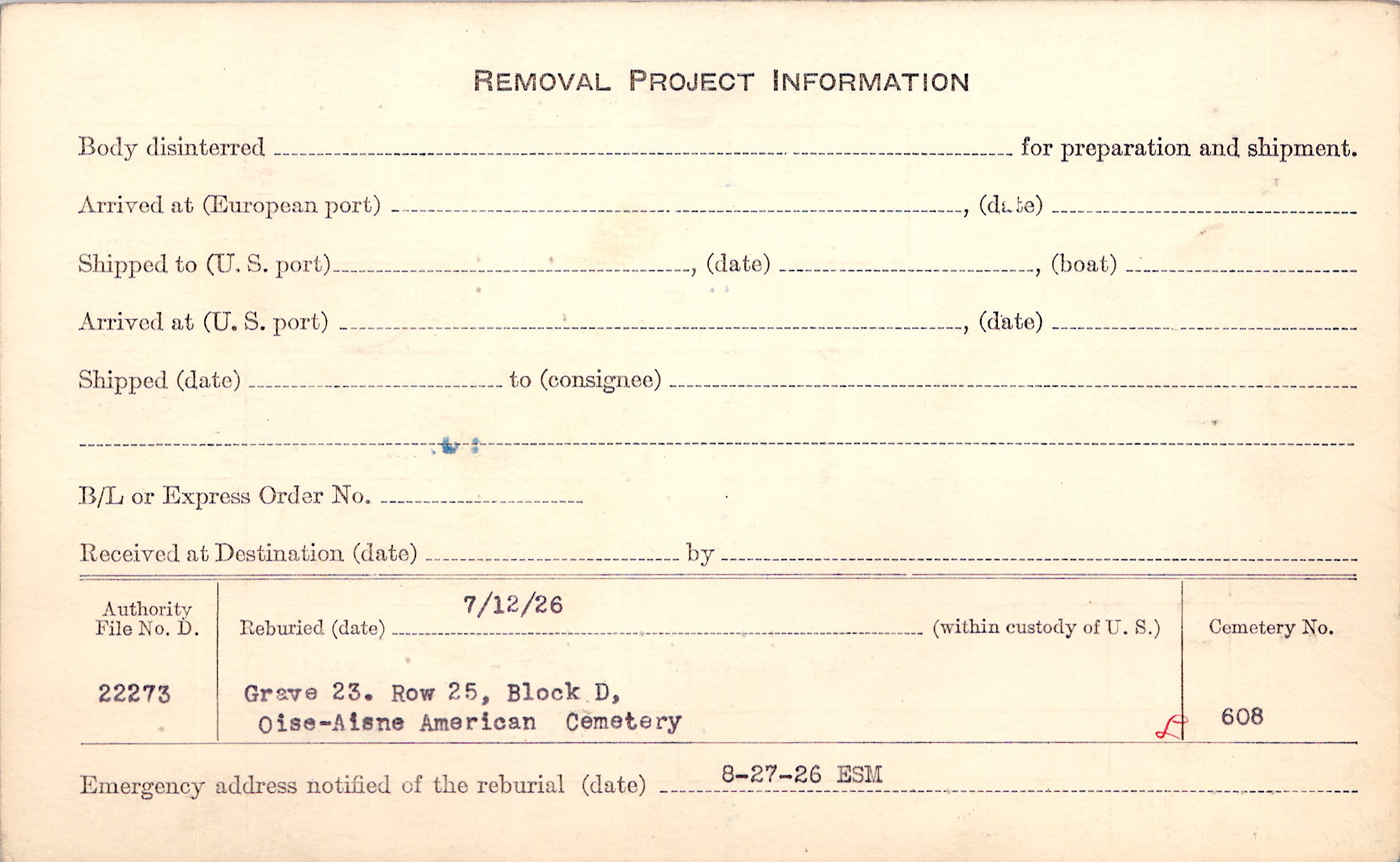 American B/A Cemetery, Seringes-et-Nesles, Aisne, Body held in Morgue
