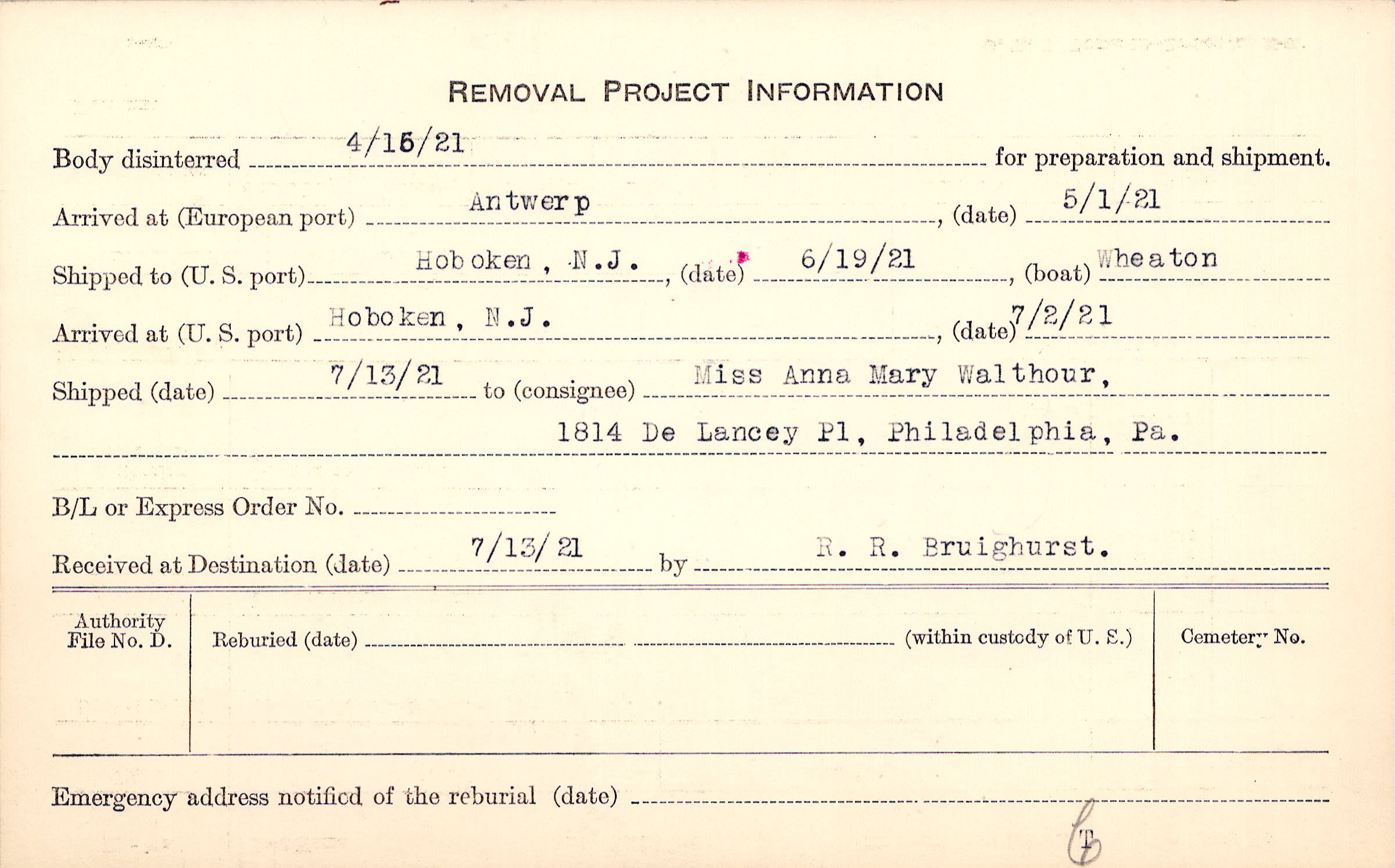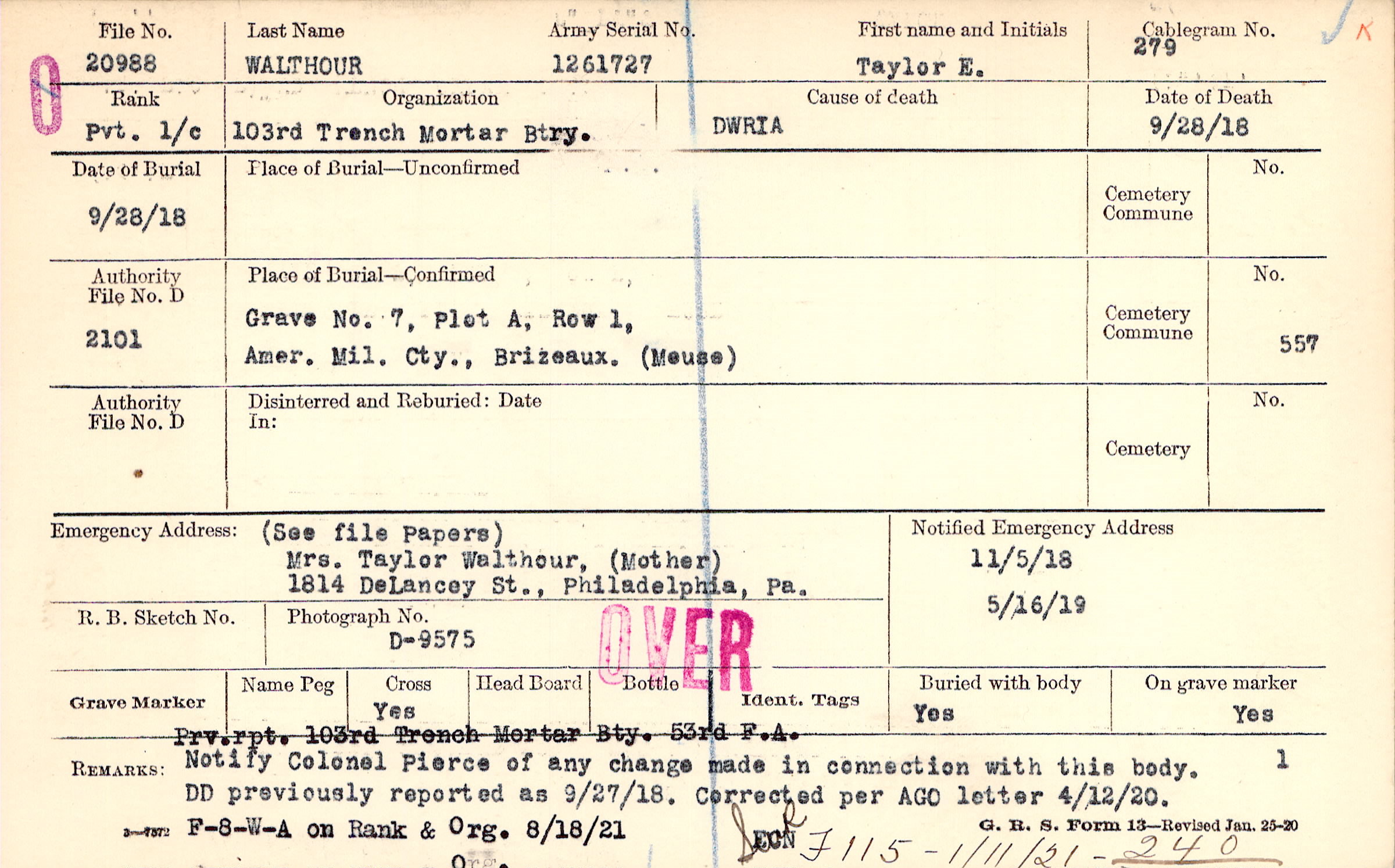Mrs. Taylor Walthour, (Mother), 1814 DeLancey St., Philadelphia, Pa., (See file Papers)