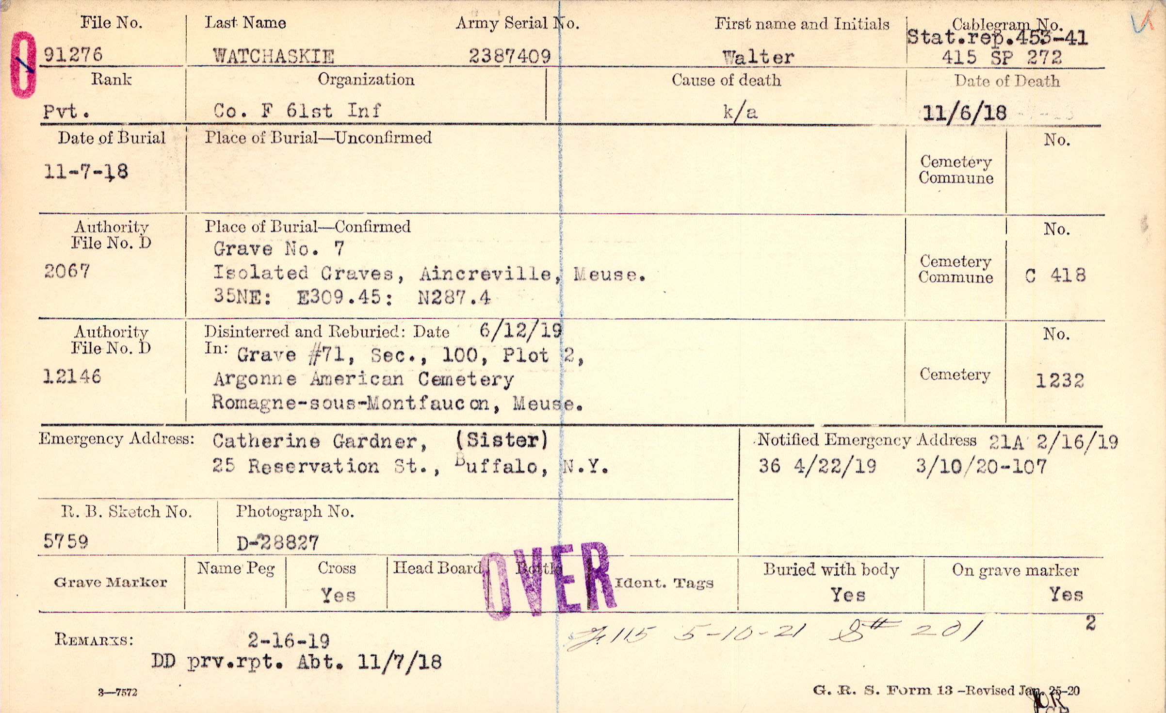 Catherine Gardner, (Sister), 25 Reservation St., Buffalo, N.Y.
