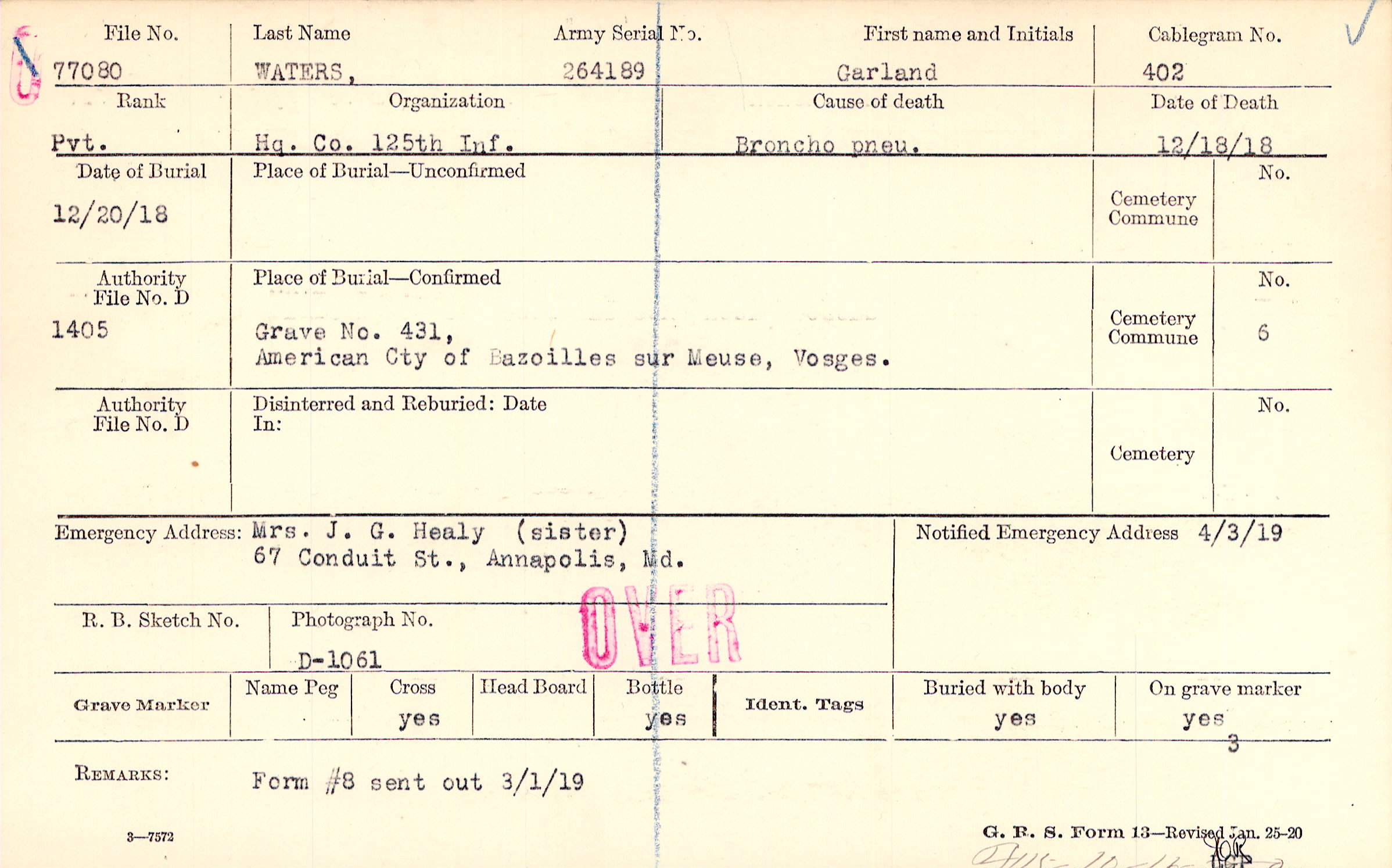 Mrs. J.G. Healy (sister), 67 Conduit St., Annapolis, Md.