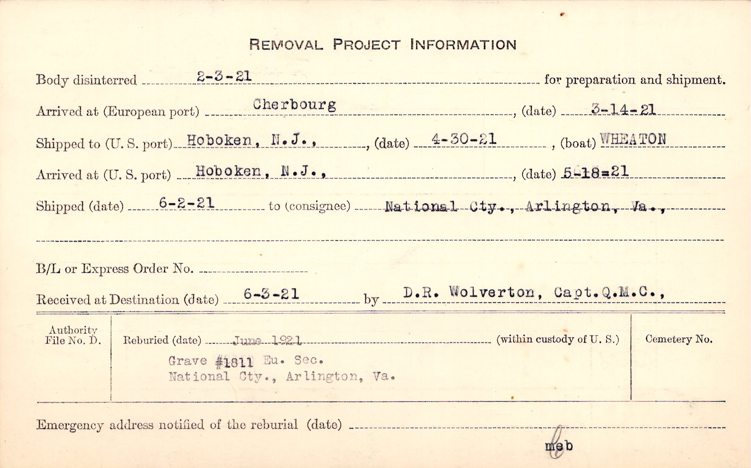 Body disinterred 2/3/1921 for preparation and shipment.
