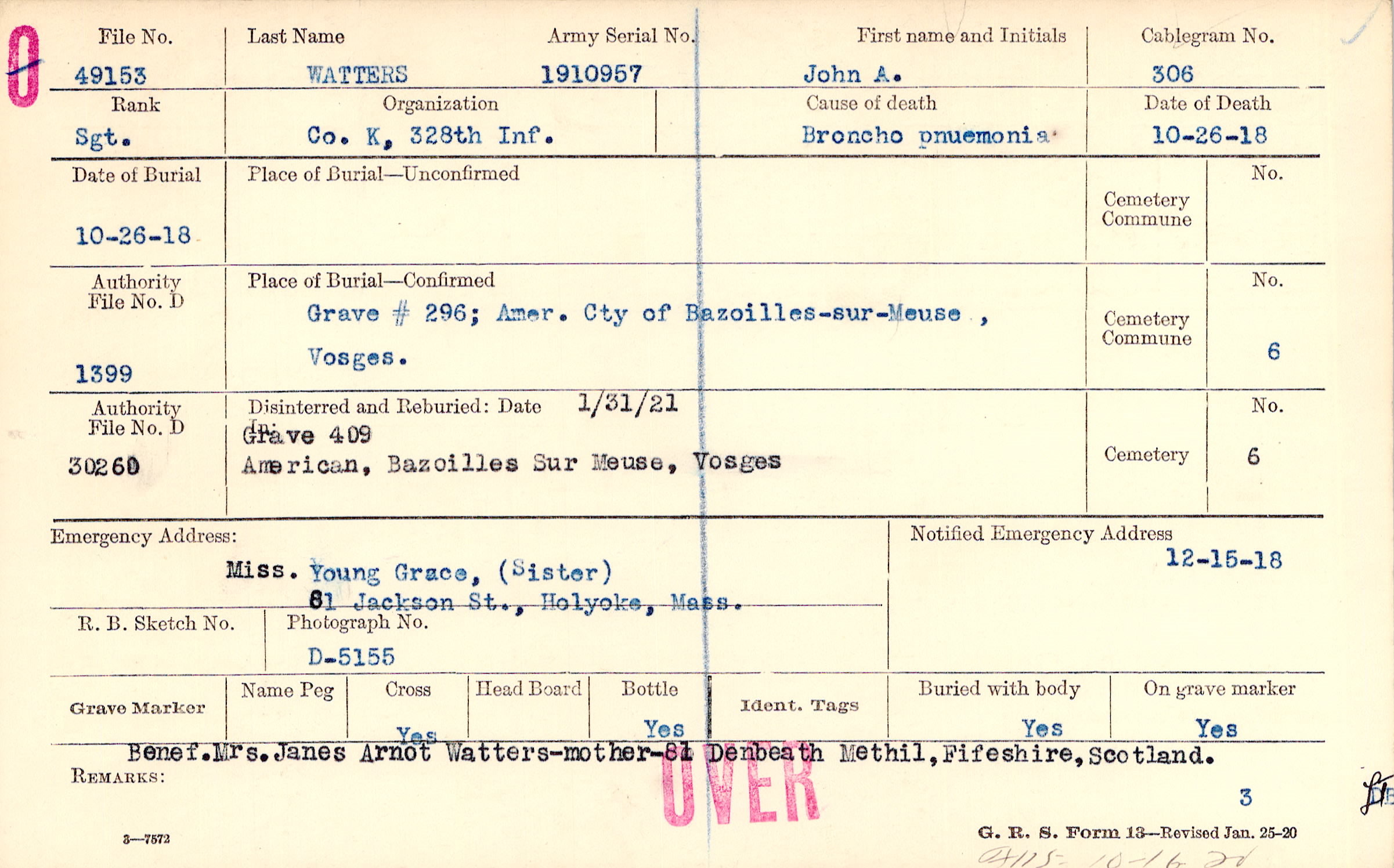 Grave # 296; Amer. Cty of Bazoilles-sur-Meuse,Vosges.,1/31/21,Grave 409,American, Bazoilles sure Meuse, Vosges
