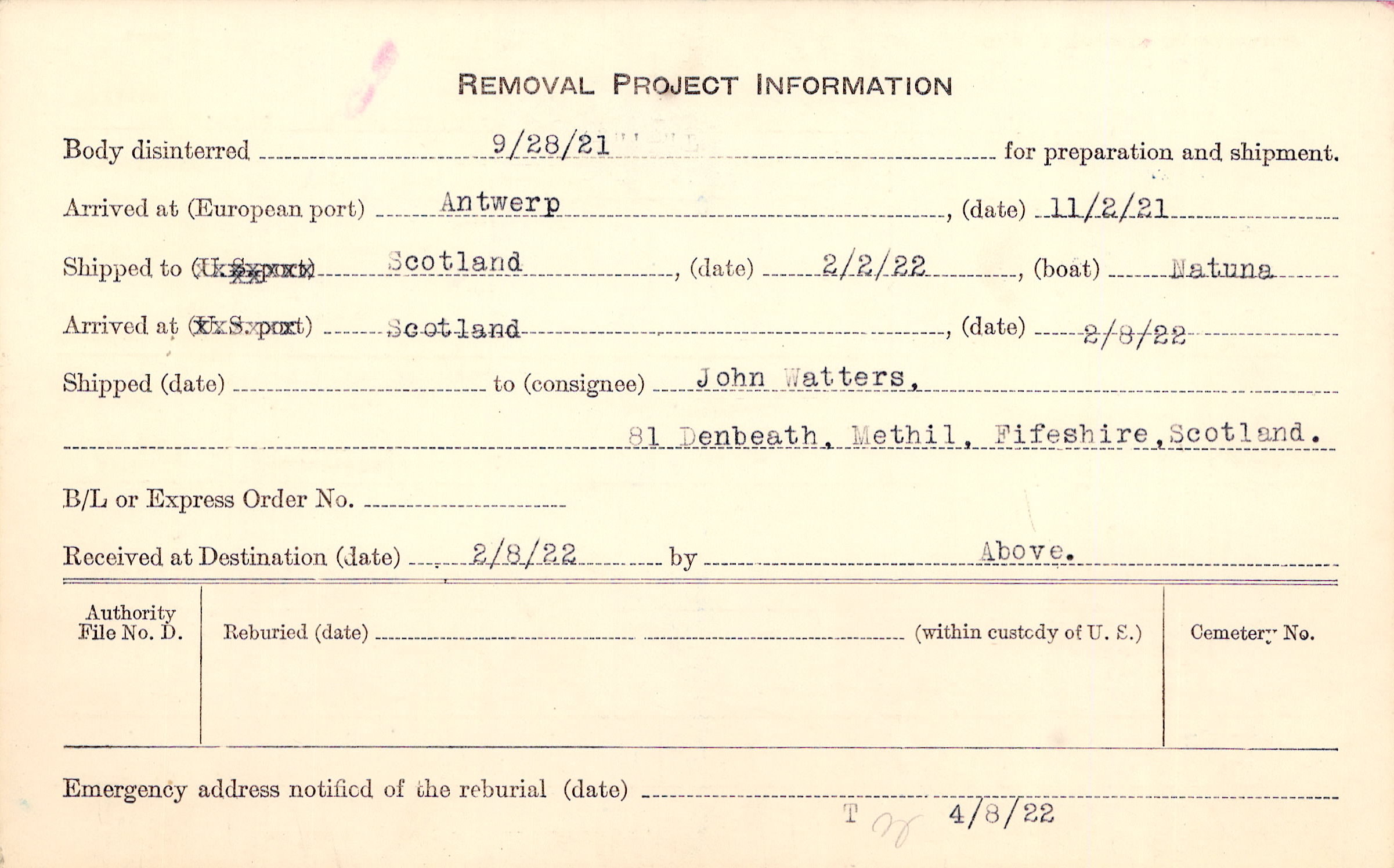 Body disinterred 9/28/1921 for preparation and shipment.
