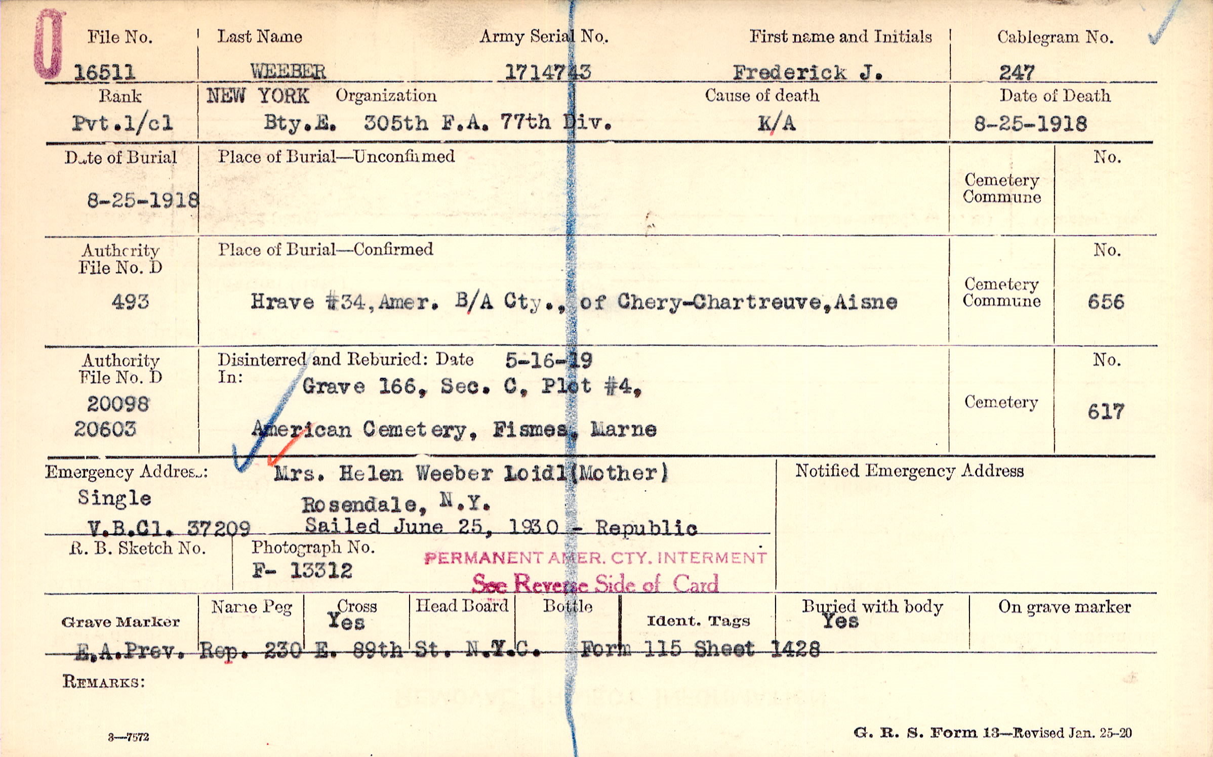 Grave 166, Section C, Plot 4, American B/A Cemetery, Fismes, Marne