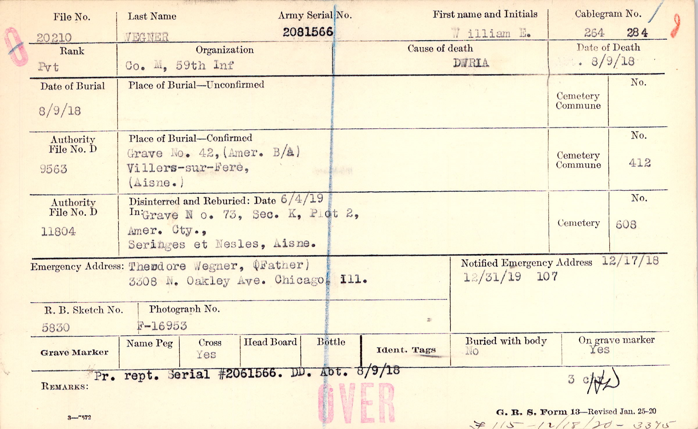 Theodore Wegner, (Father), 3308 N. Oakley Ave. Chicago, Ill.