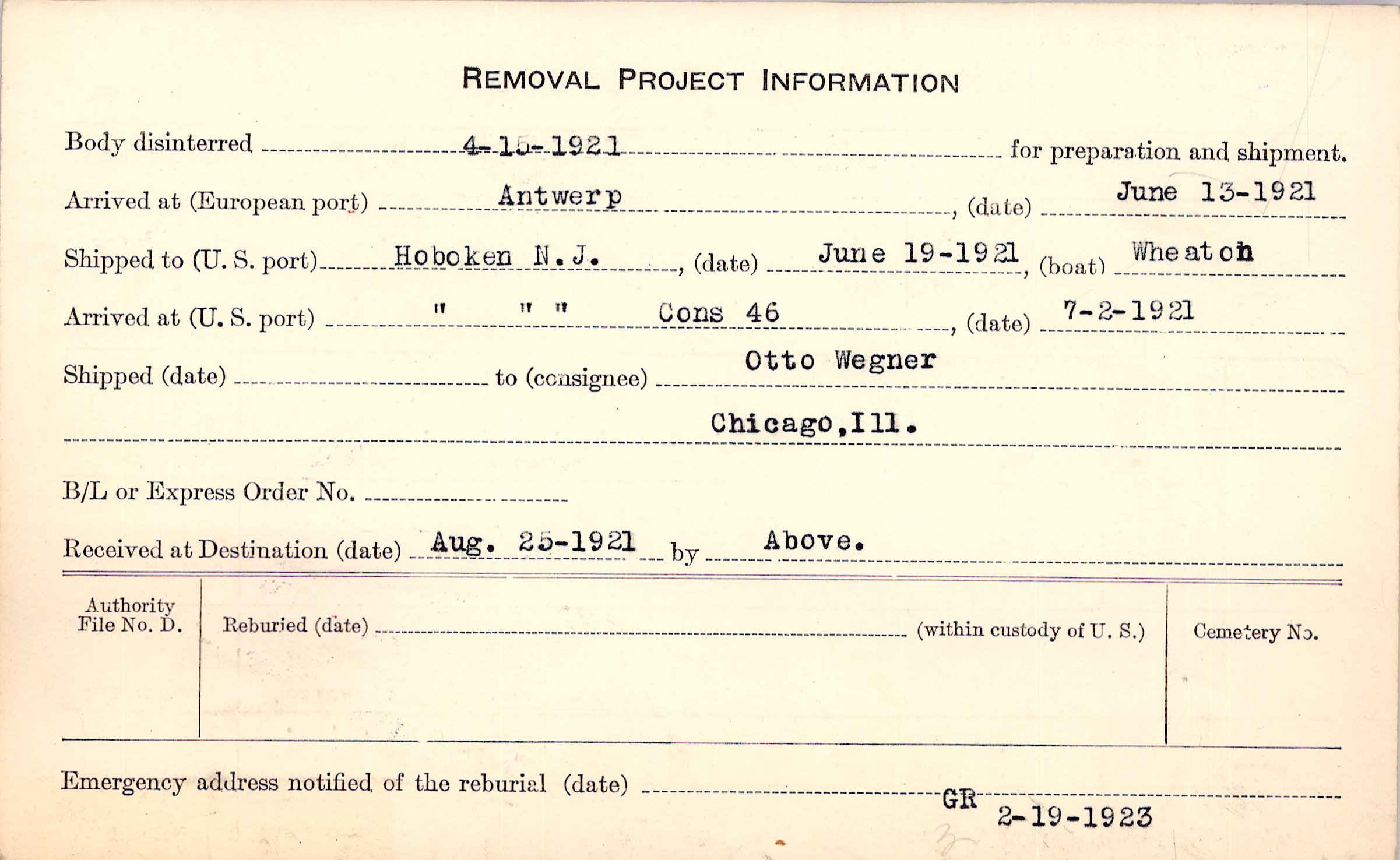 Body disinterred 4/15/1921 for preparation and shipment.