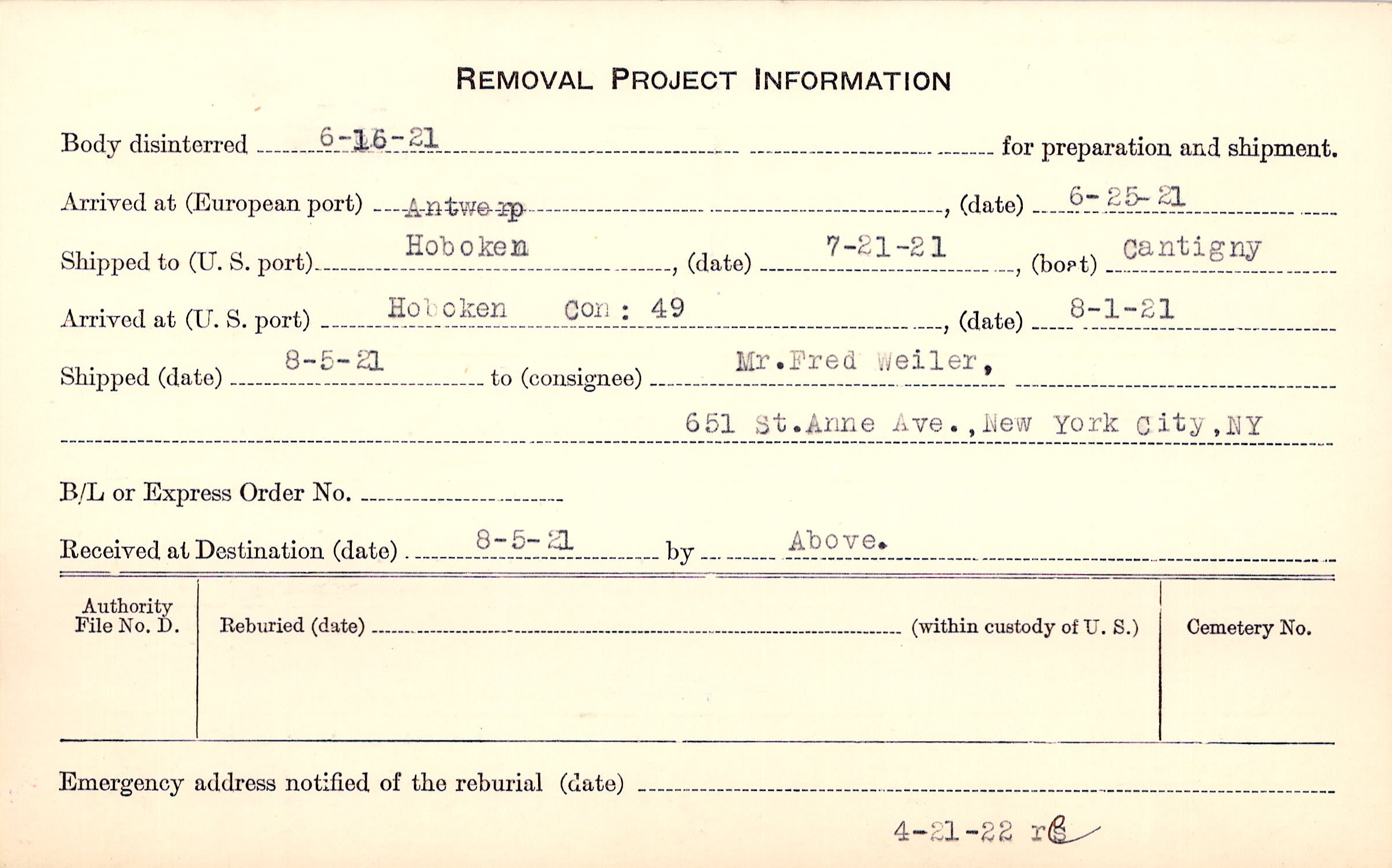 Body disinterred 6/16/1921 for preparation and shipment.