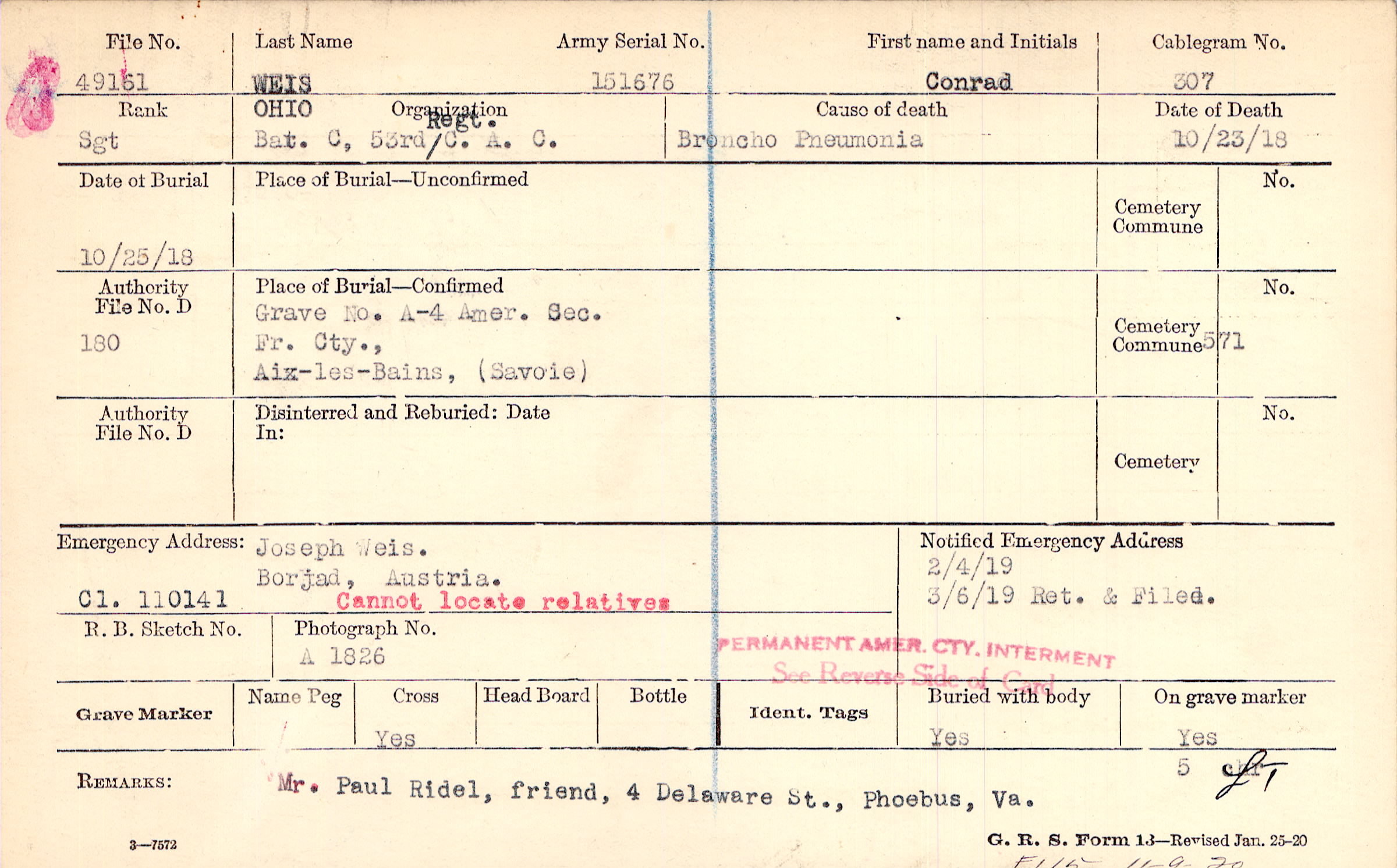 Joseph Weis., Borjad, Austria., Cl 110141. Cannot locate relatives.
