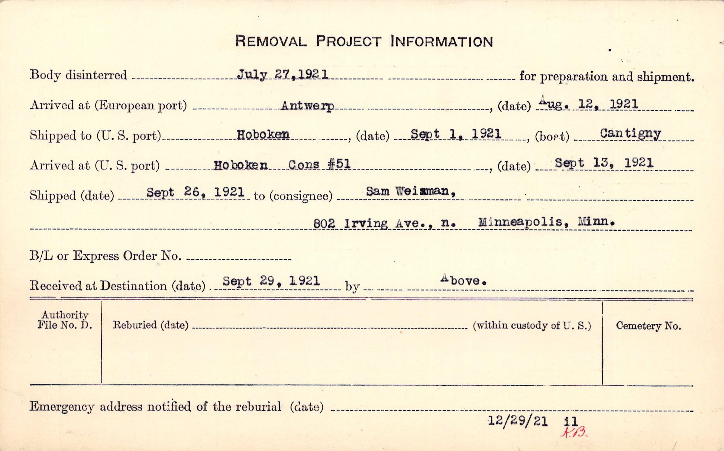 Body disinterred 7/27/1921 for preparation and shipment.