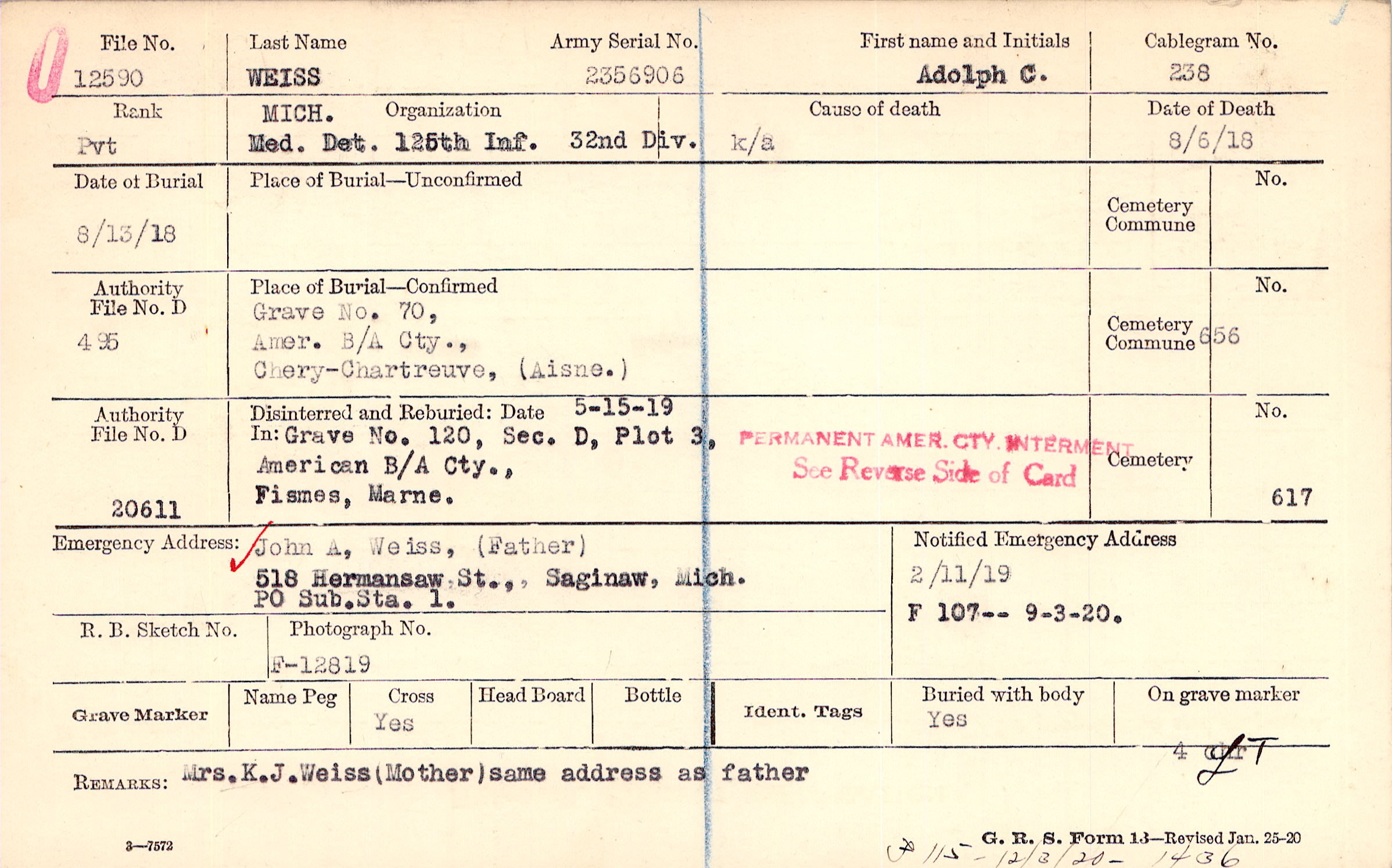 John A, Weiss, (Father), 518 Hermansaw St., Saginaw, Mich., PO Sub. Sta. 1.
