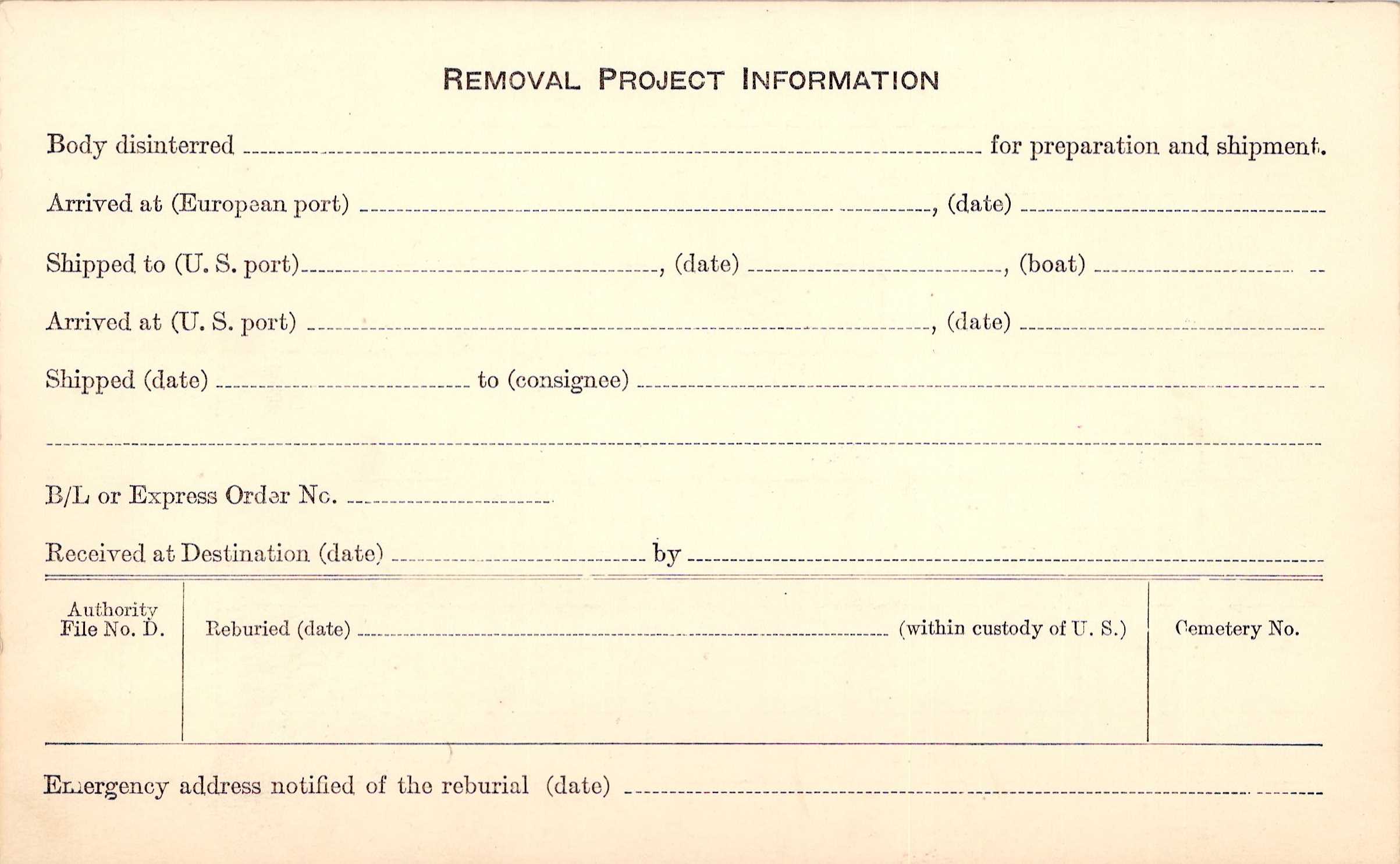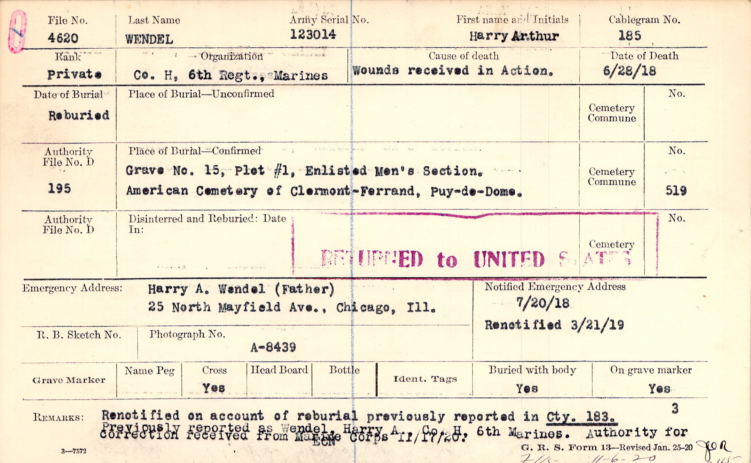 Renotified on account of reburial previously reported in [underline]Cty. 183.[/underline] Previously reported as Wendel, Harry, A., Co. H, 6th Marines. Authority for correction received from Marine Corps 11/17/20, F115 11-6-20 115