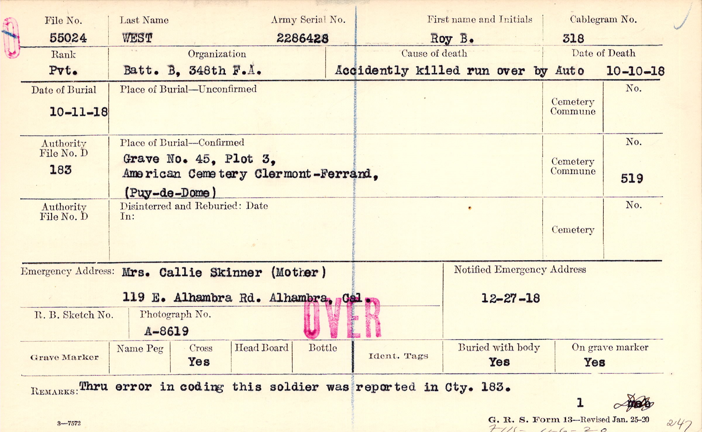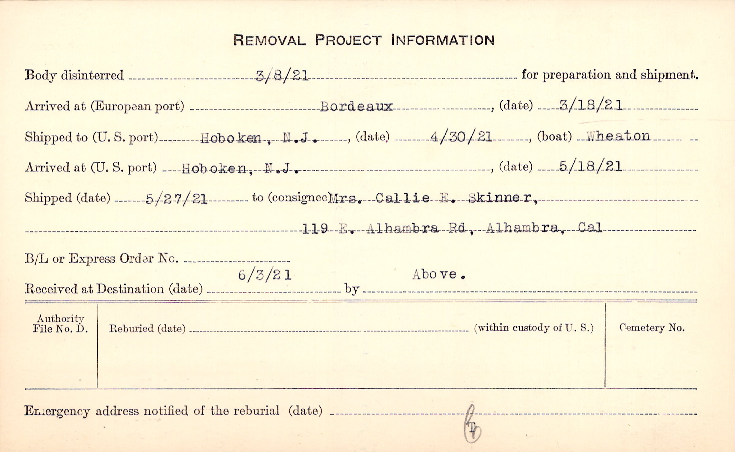 Mrs. Callie Skinner (Mother), 119 E. Alhambra Rd. Alhambra, Cal.