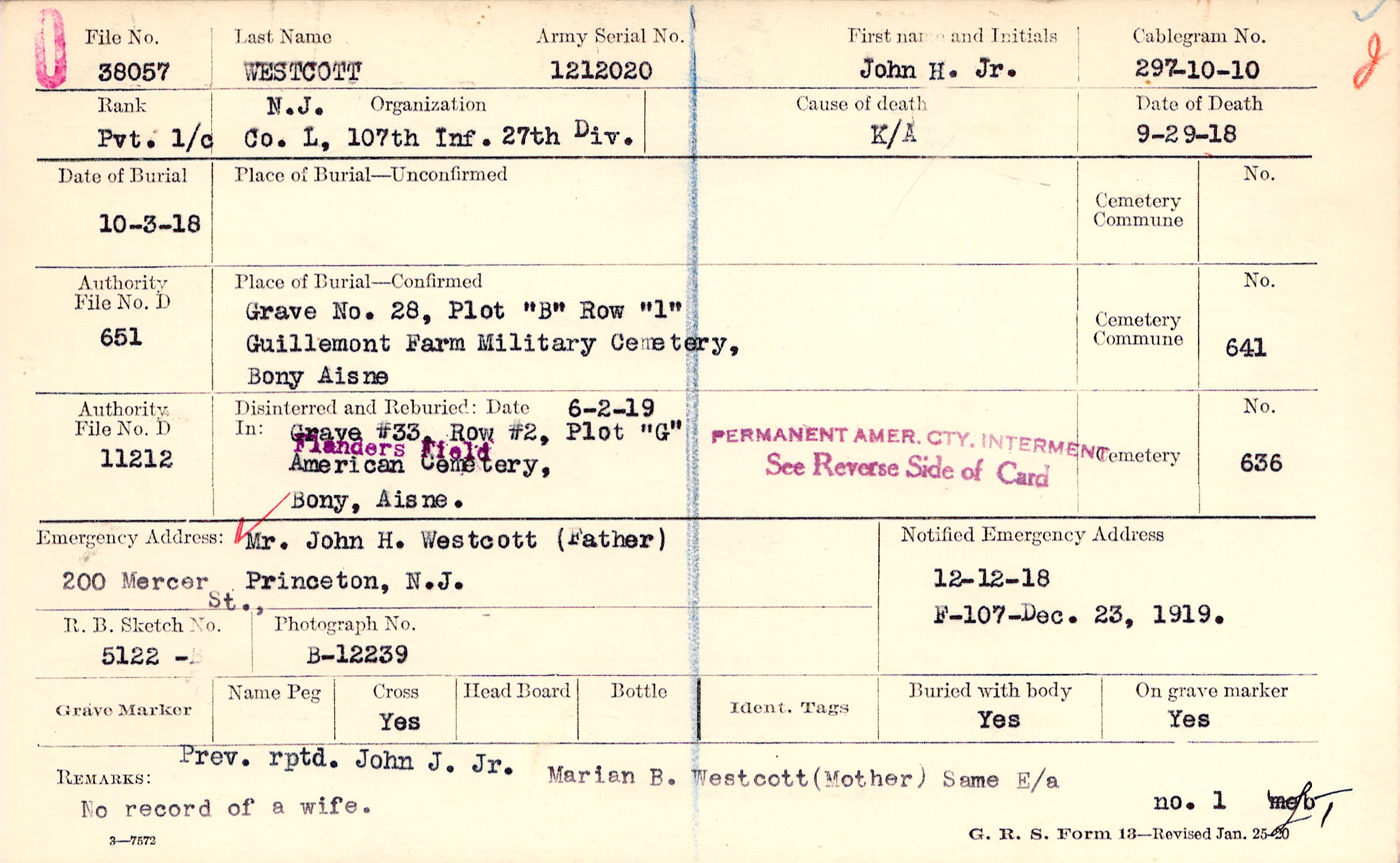 Mr. John H. Westcott (Father), 200 Mercer St., Princeton, N.J.