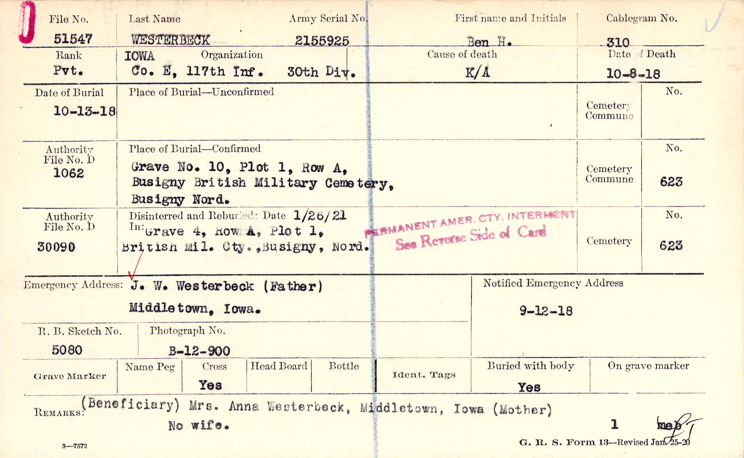 (Beneficiary) Mrs. Anna Westerbeck, Middletown, Iowa, (Mother), No wife.