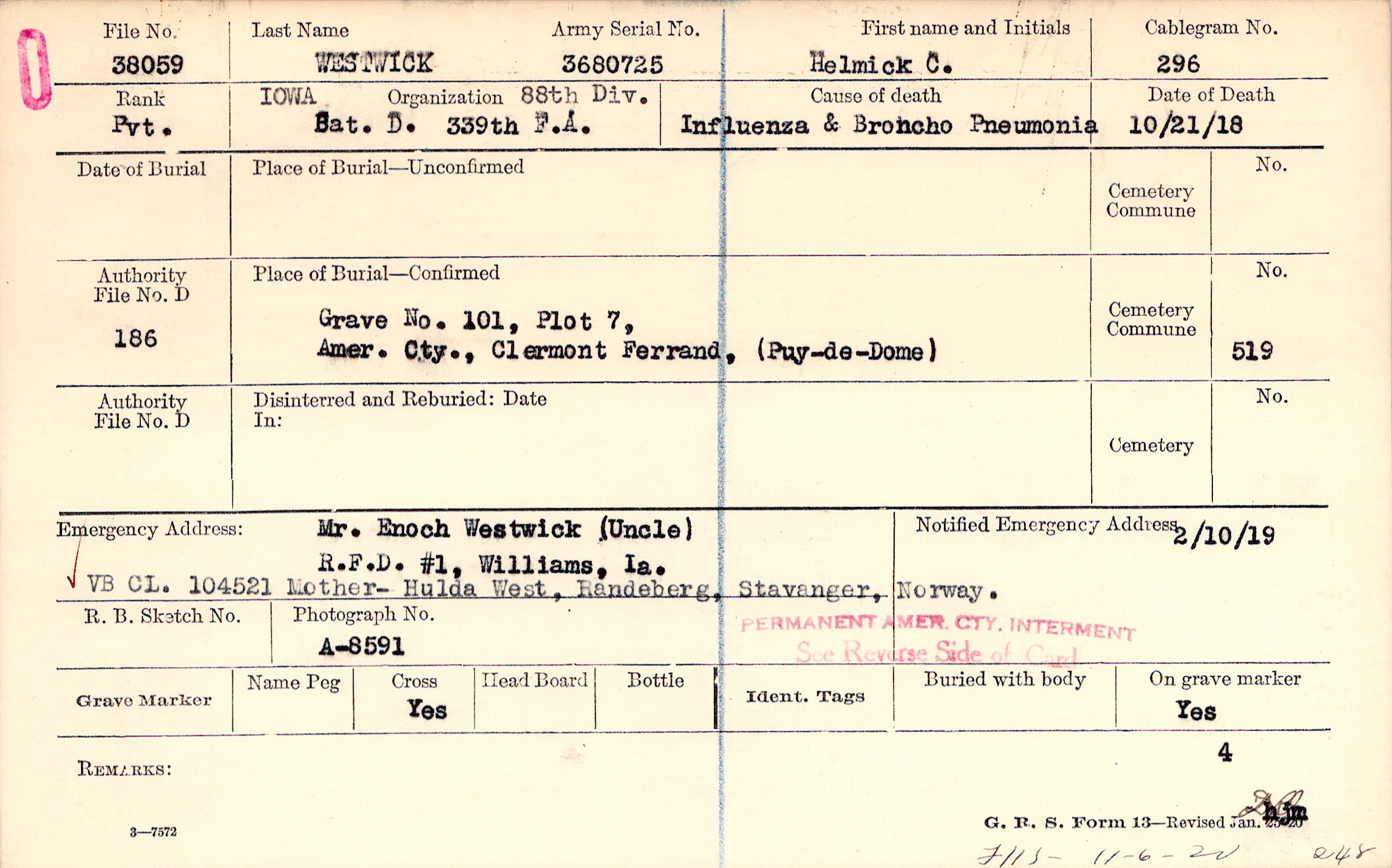 Grave 101, Plot 7, Amer. Cty., Clermont Ferrand, Puy-de-Dome