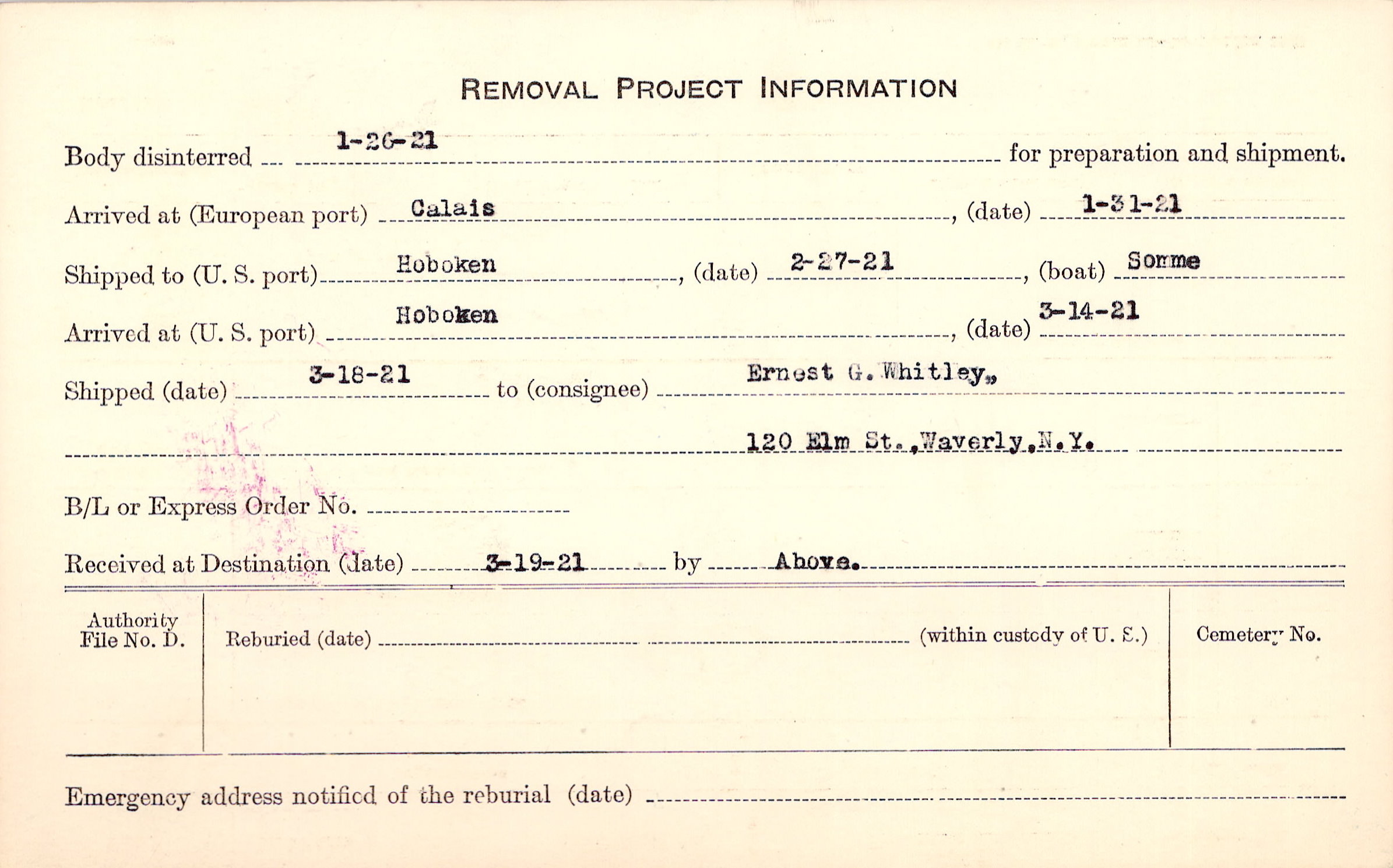 Body disinterred 1/26/1921 for preparation and shipment.