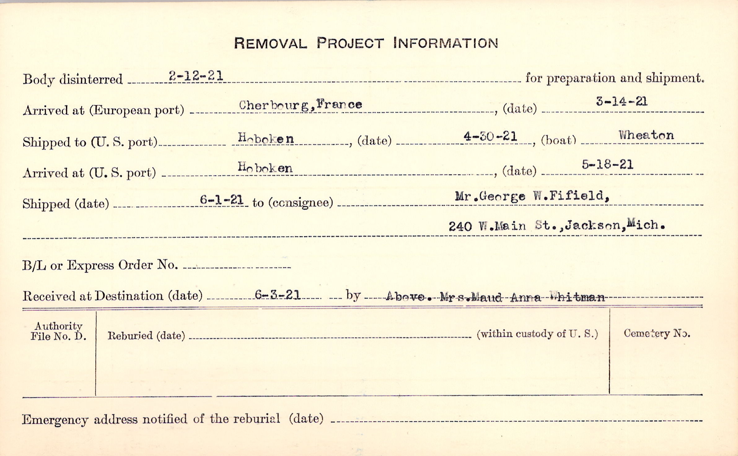 Body disinterred 2/12/1921 for preparation and shipment.