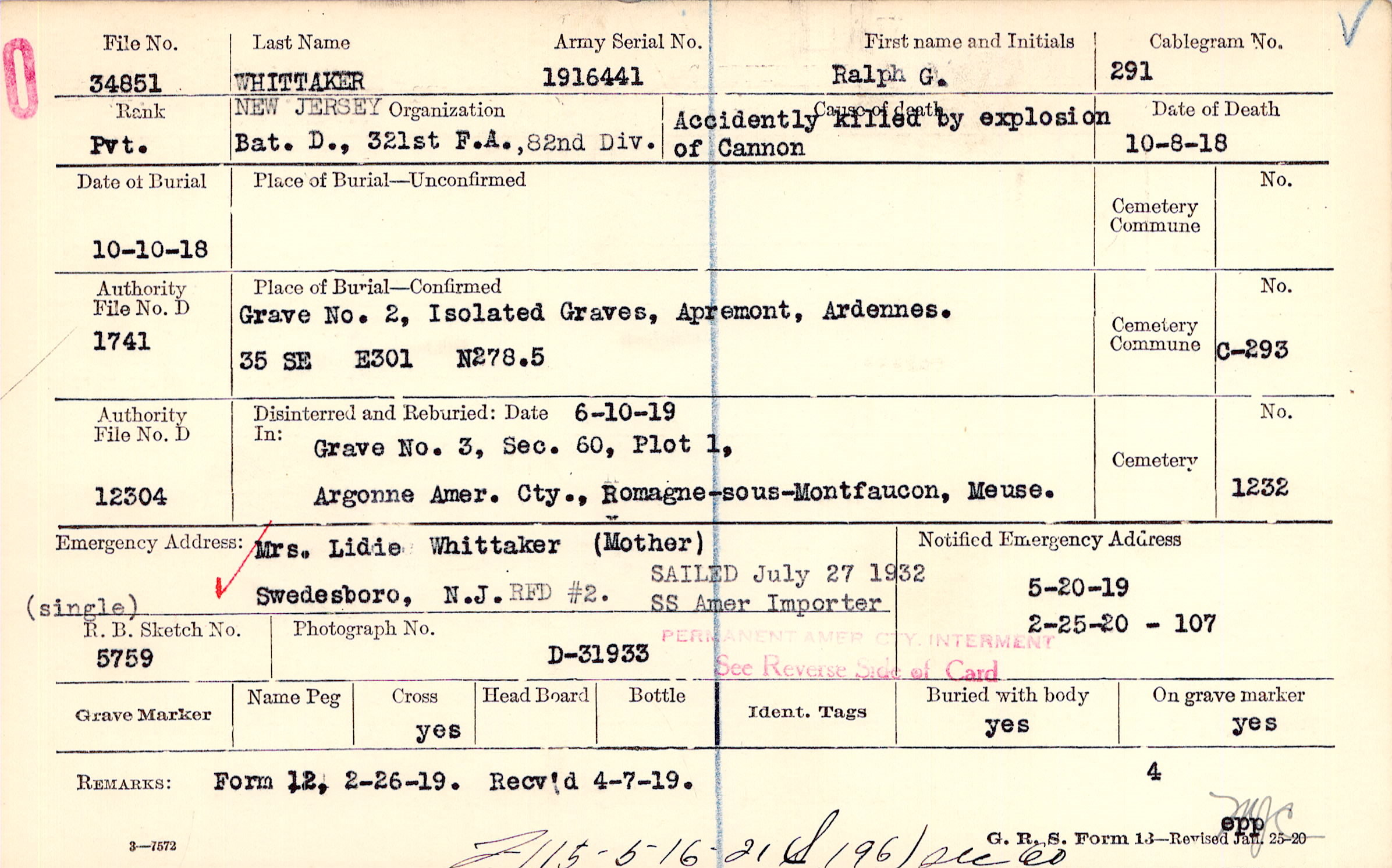 Mrs. Lidie Whittaker (Mother), Swedesboro, N.J., (single) RFD #2. SAILED July 27 1932 SS Amer Importer