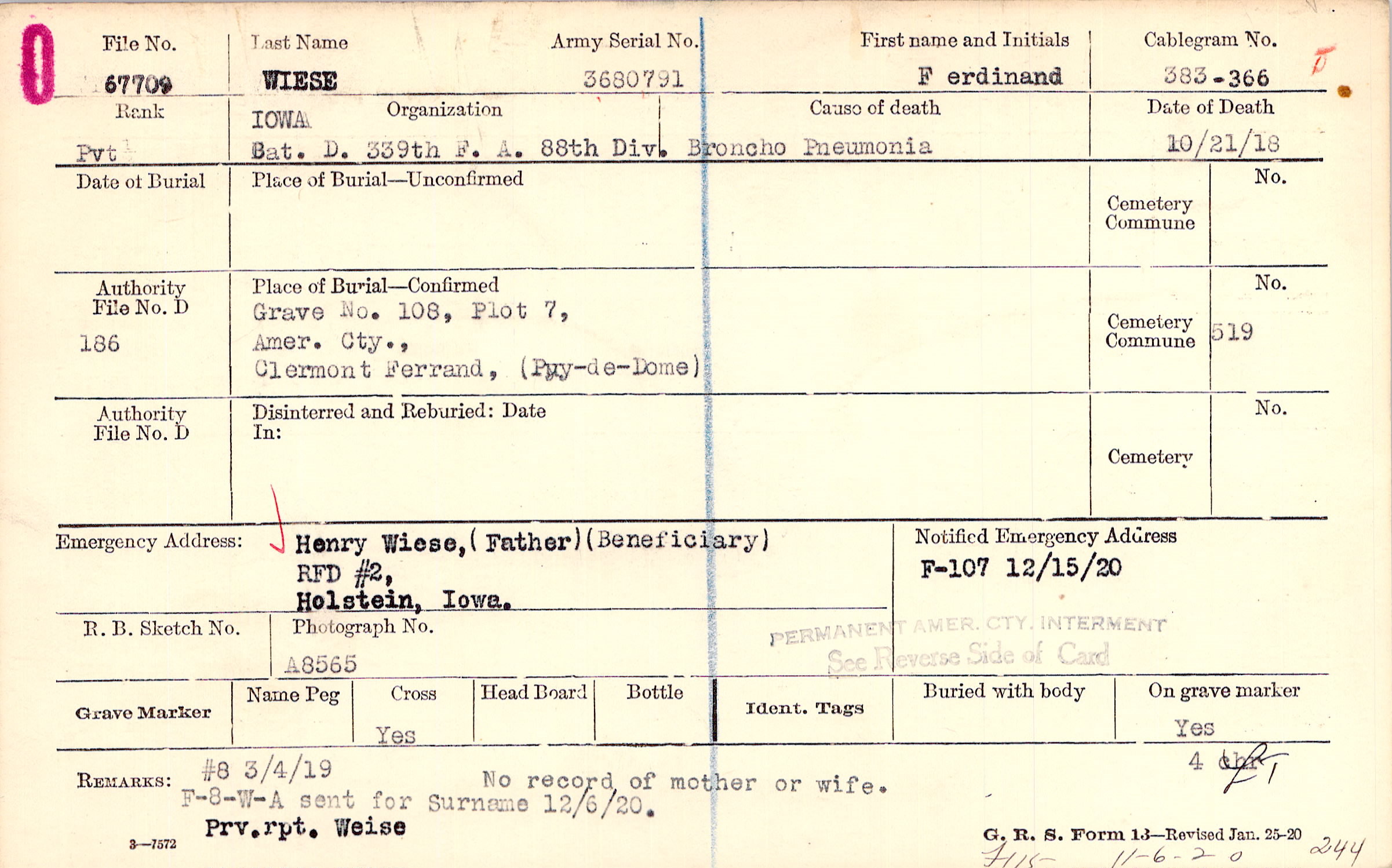 Grave 108, Plot 7, Amer. Cty., Clermont Ferrand, (Puy-de-Dome).