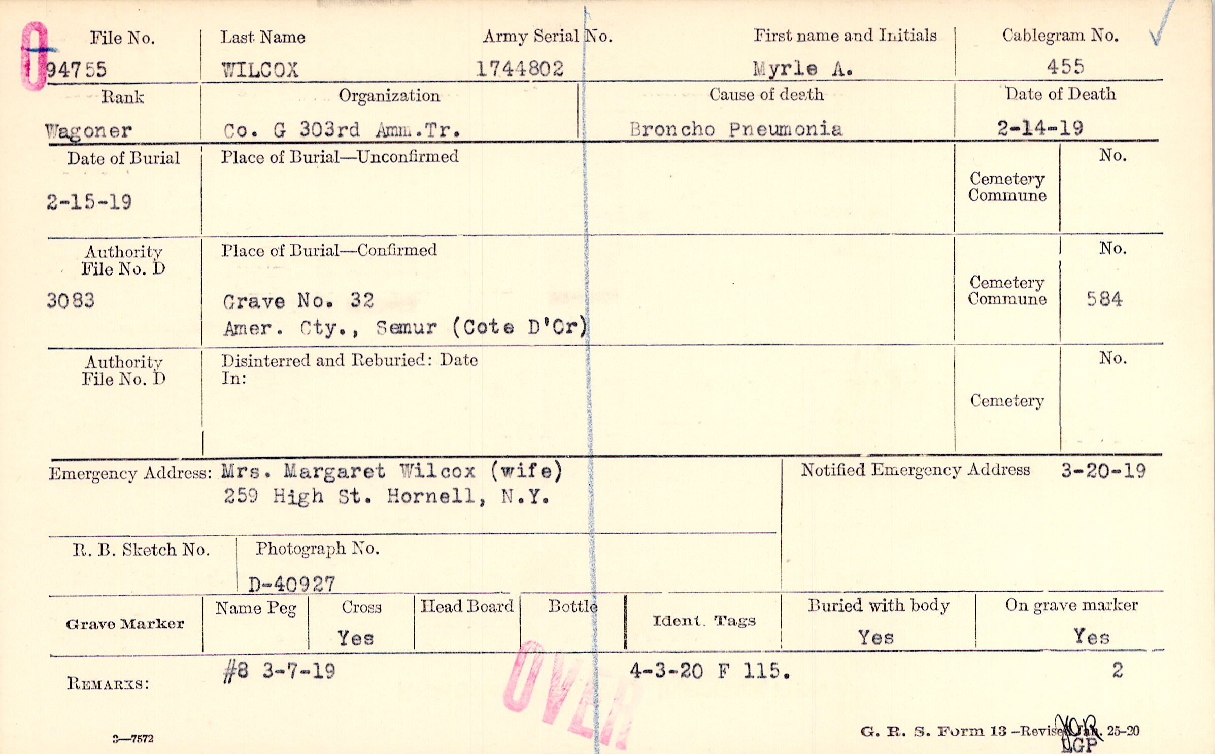 Mrs. Margaret Wilcox (wife), 259 High St. Hornell, N.Y.
