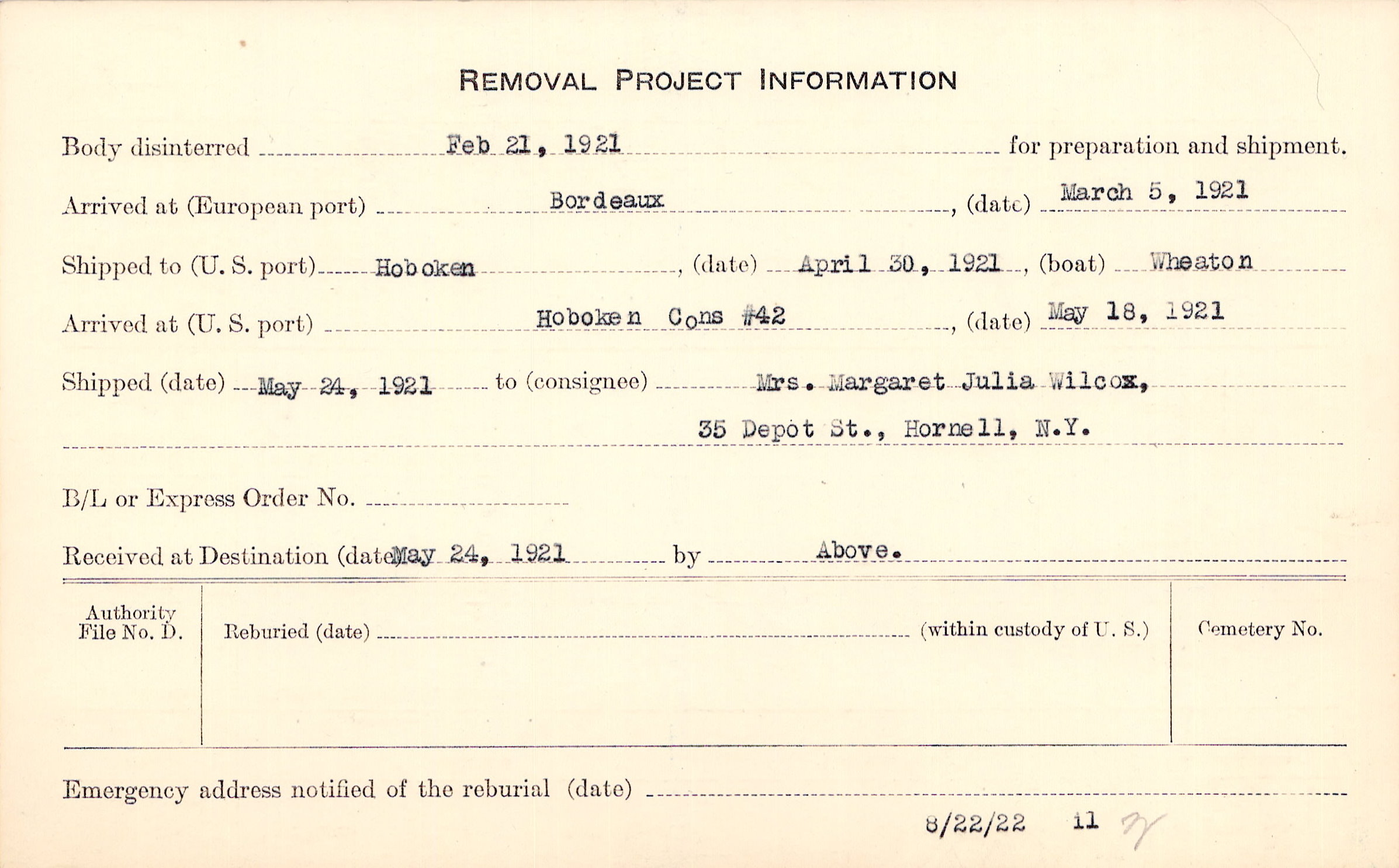 Body disinterred 2/21/1921 for preparation and shipment.